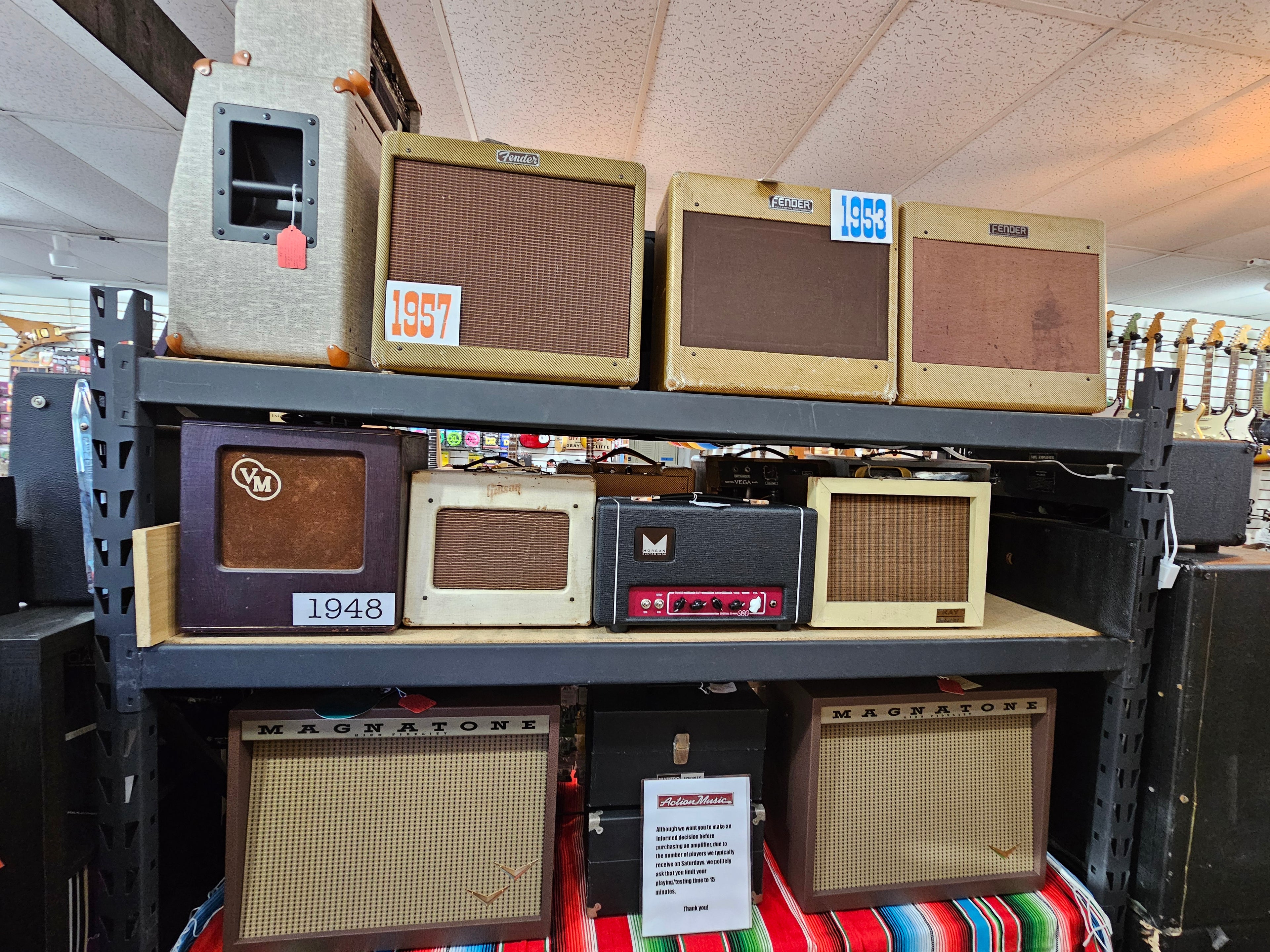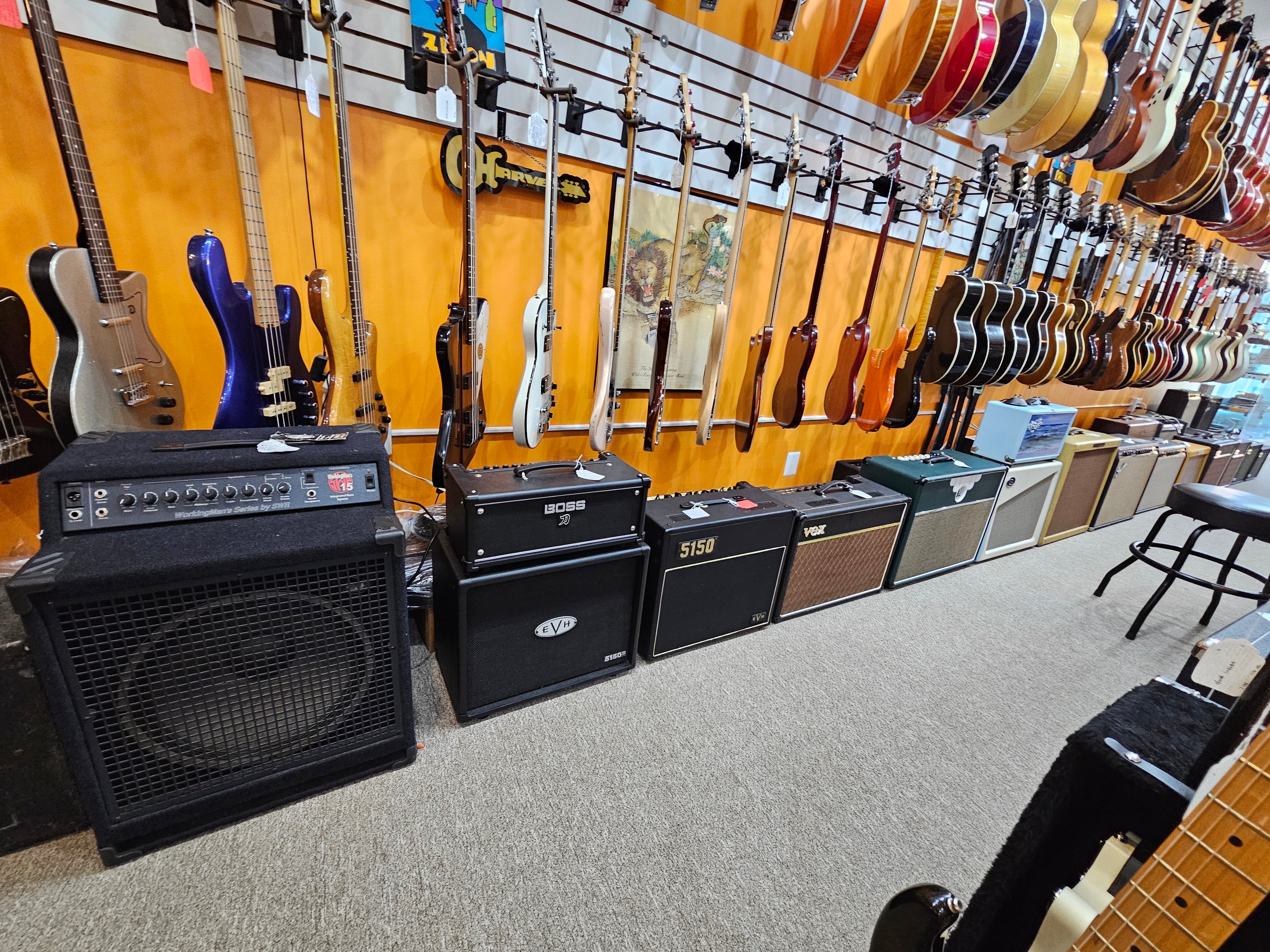 A great selection of both new and used amps from Marshall, Mesa, Magnatone, Swart, Genzler, AER, Vox, Orange, Bogner, EVH, Classic Fender Amps.