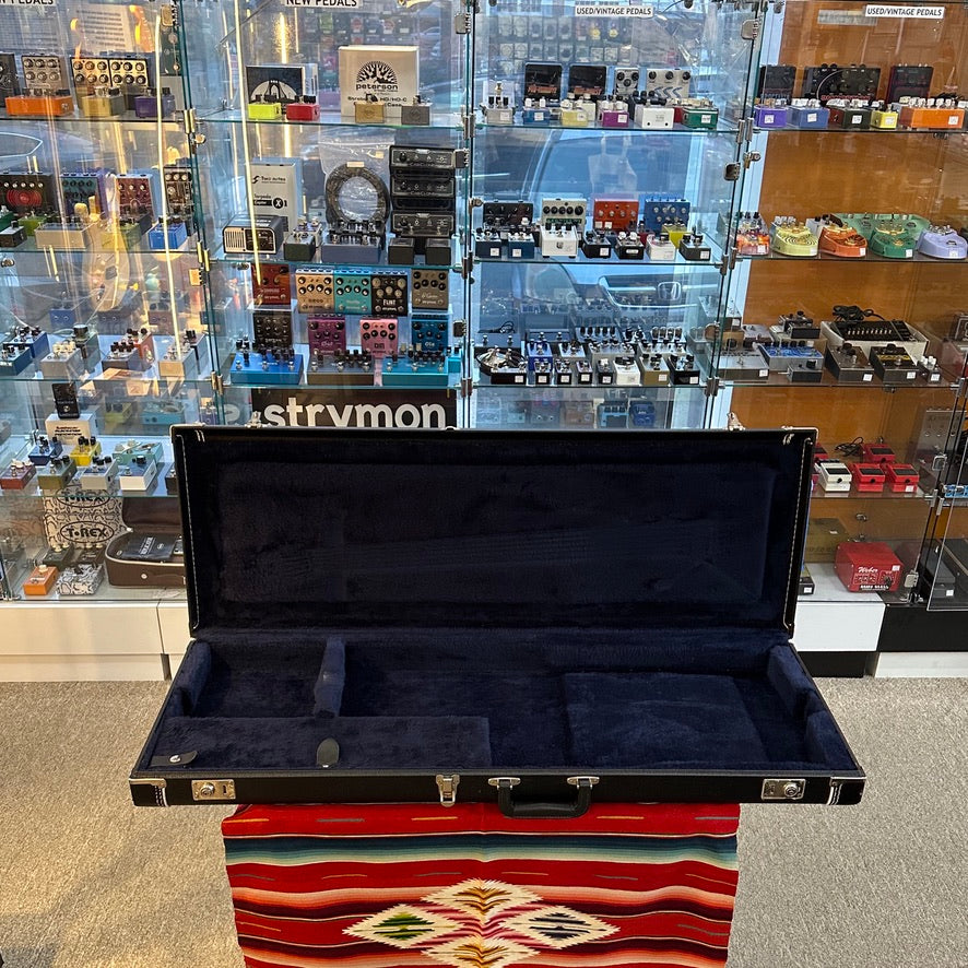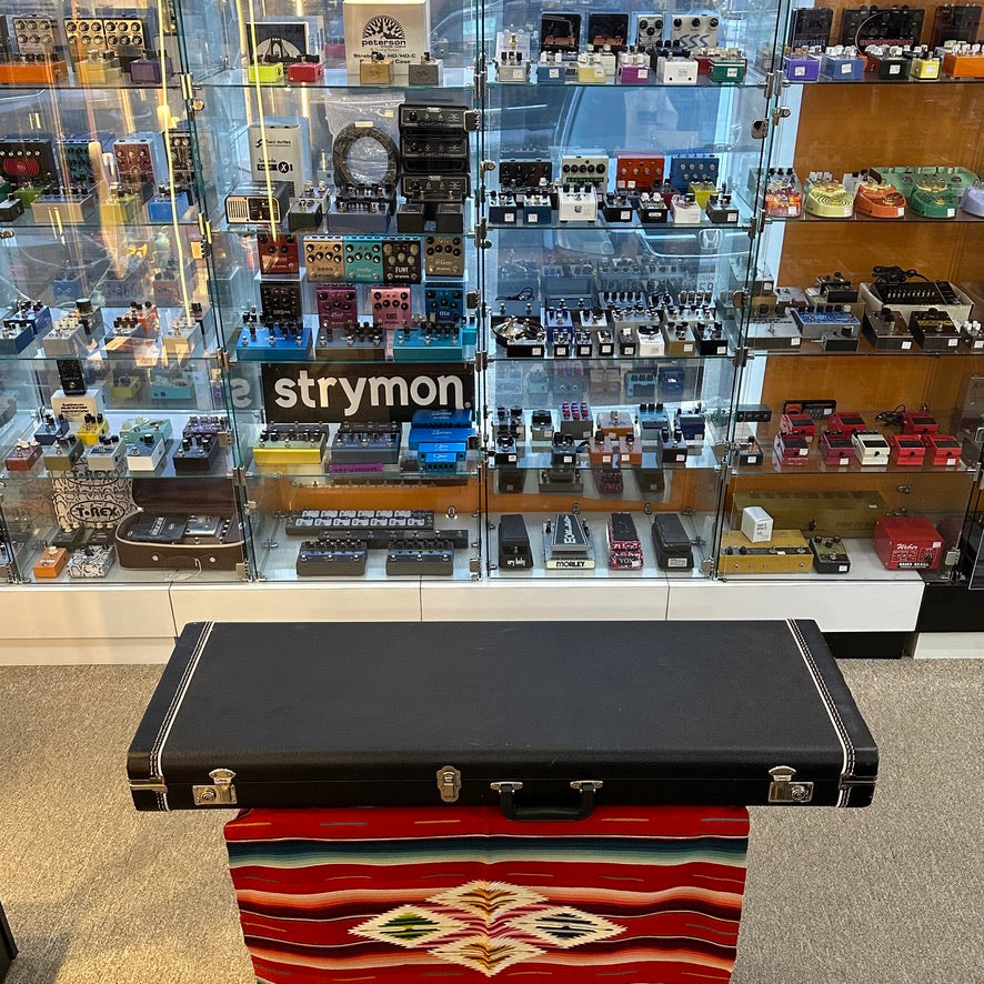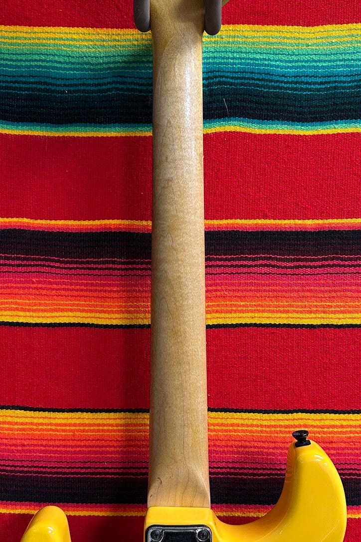 1983 Charvel San Dimas "Pre-Production" in Black/Yellow Spiral Checkerboard. Refinished and Restored by GMW Guitars of Glendora, CA. Original Body, Neck, and Neck Plate. Alder Body with Veneered Top. Maple Neck with Thin Profile. Rosewood Fretboard with White Dot Inlays. 1.69" Nut Width. 25.5" Scale Length. 1x Later Seymour Duncan Humbucking Pickup with Master Volume Control. Has Had Removed Floyd Rose and Kahler Tremolos and Now Replaced with Brass "V-Trem". Comes with HSC
