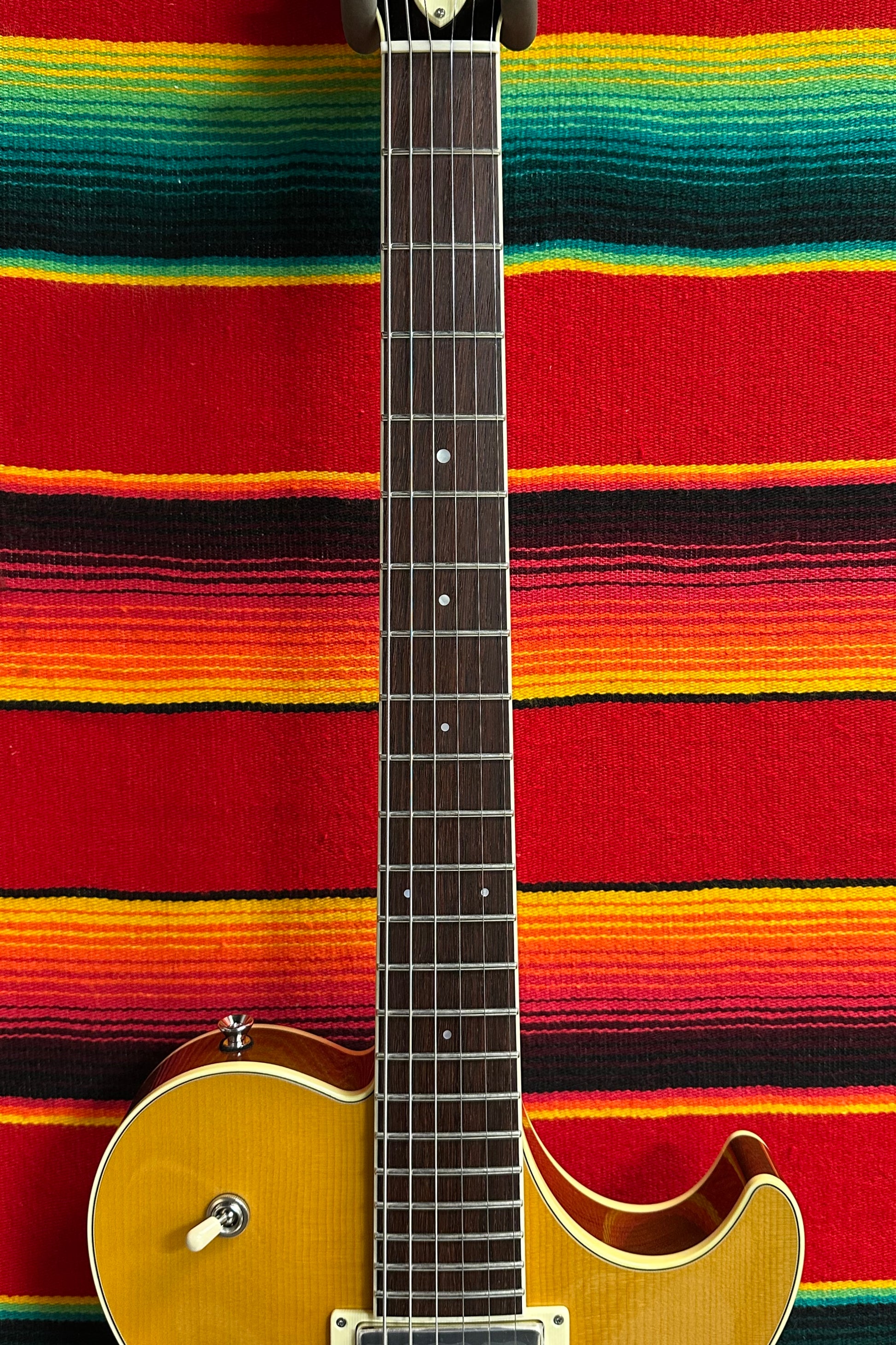 2025 Collings SoCo Deluxe in Blonde. Solid 2-piece European Spruce Top with Maple Center Block. Solid Honduran Mahogany Back and Sides. Grained Ivoroid Body Binding. Honduran Mahogany Neck with Grained Ivoioid Bound Headstock and C Profile. Grained Ivoroid Bound Rosewood Fretboard with Mother of Pearl Long Dot Inlays. Grained Ivoroid Truss Rod Cover. 1 11/16" Bone Nut. 12" Fretboard radius. 24 7/8" Scale Length. 2x Lollar Low Wind Imperial Humbucking Pickups with Grained Ivoroid Mounting Rings. Individual Volume and Tone Controls with Grained Ivoroid Top Hat Knobs. 3-way Selector Switch. CTS 500K Potentiometers and Jupiter Vintage Yellow Capicitors with '50s Wiring. Kluson ABR-1 Bridge and Stop Tailpiece. Comes with OHSC and Factory Warranty