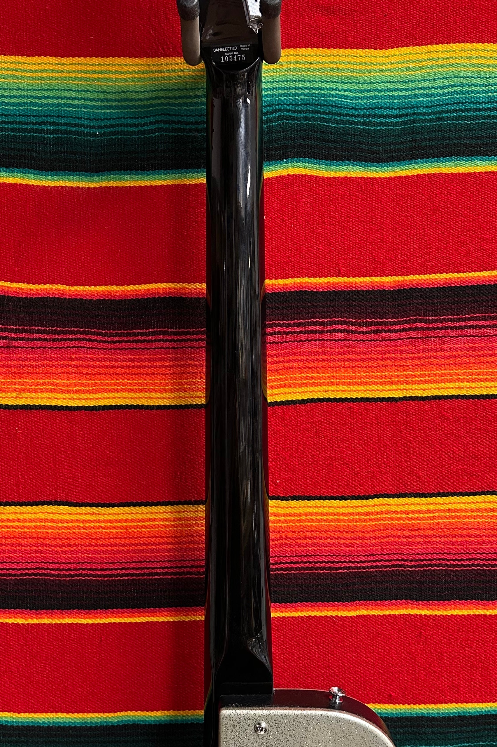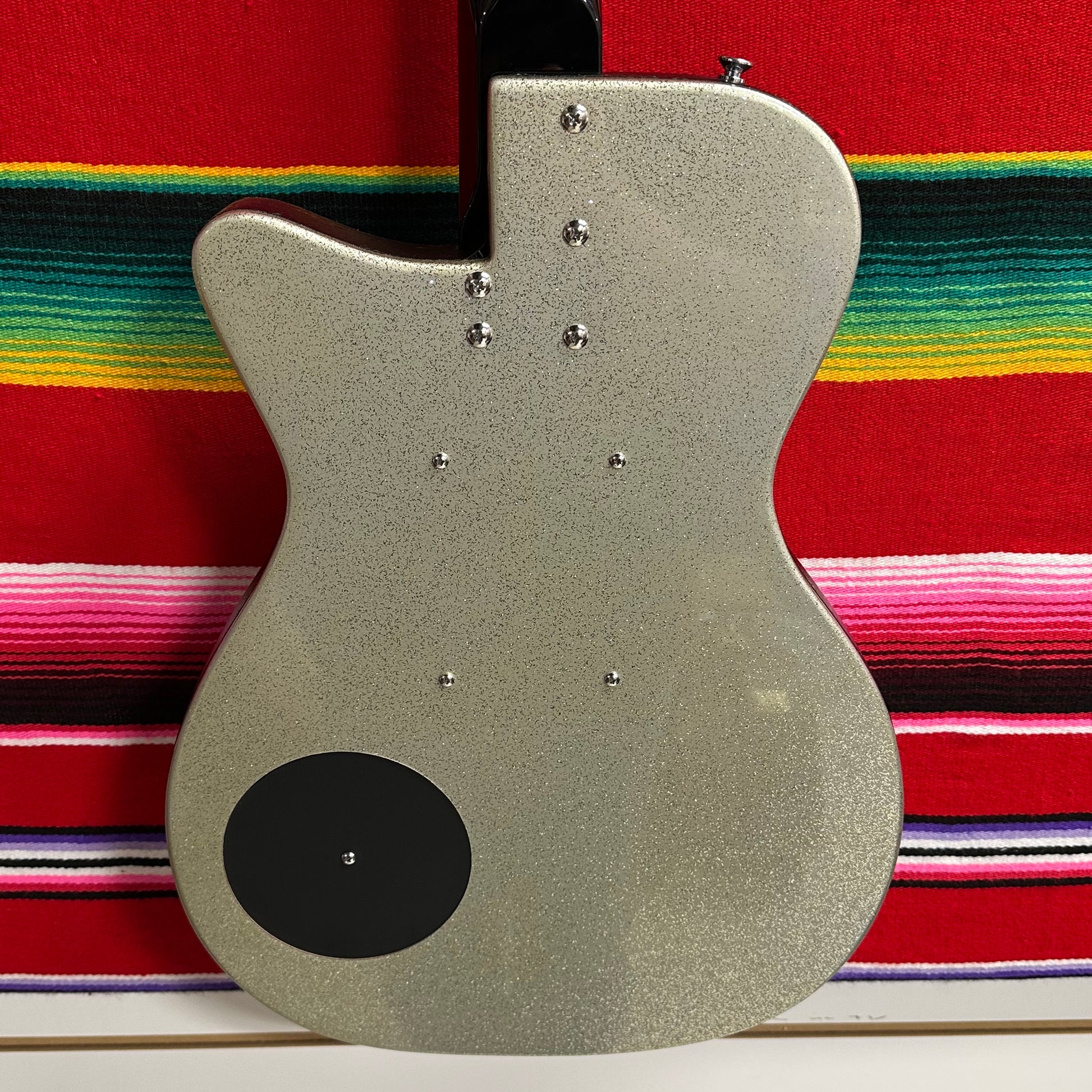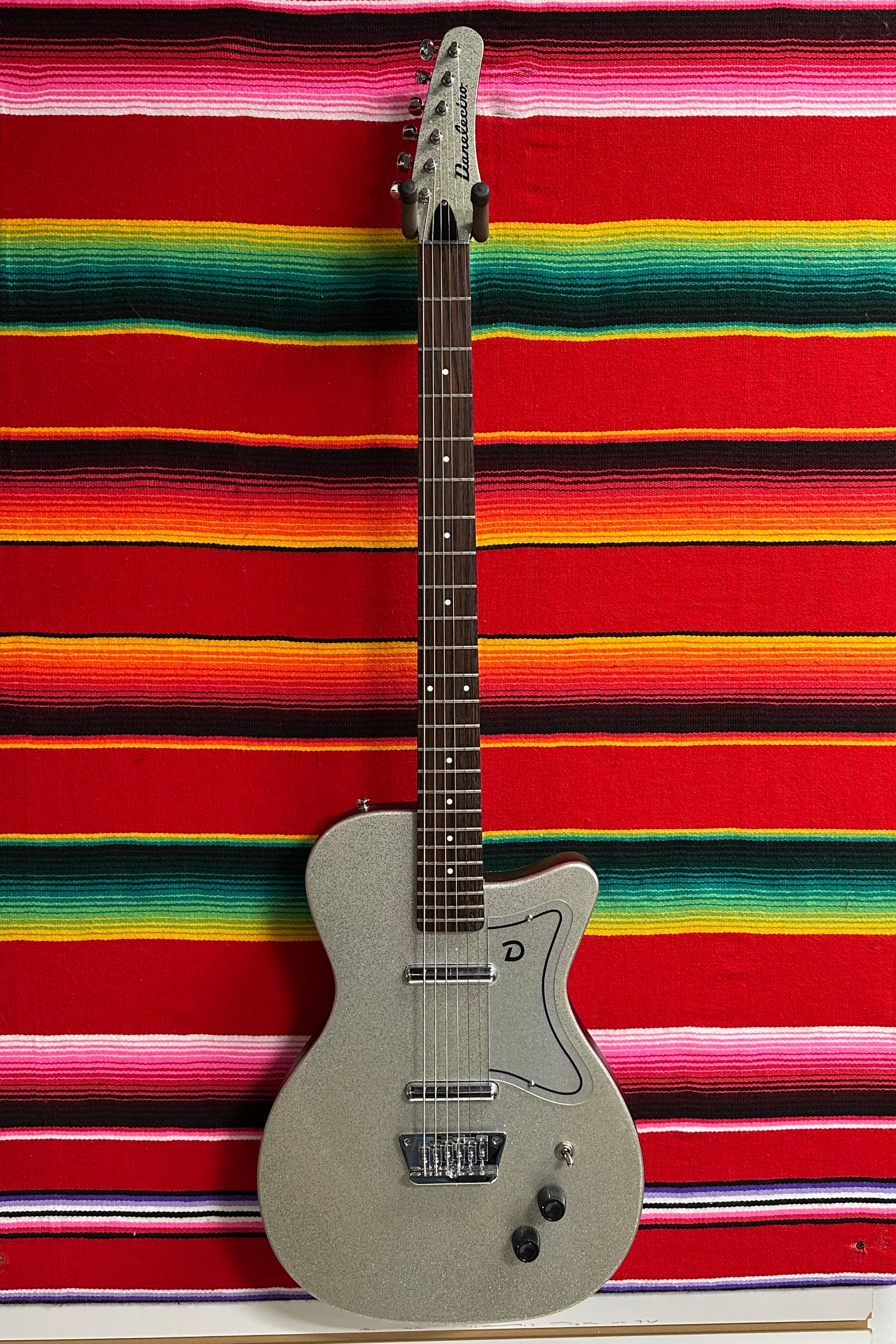 Danelectro '56 Baritone in Silver Metalflake. 6 String Baritone Guitar with Chambered Spruce Body and Hardboard Top and Back. Maple Neck with Pau Ferro Fretboard. 1.64" Nut Width. 14" Fretboard Radius. 29.75" Scale Length. 2x Lipstick Single Coil Pickups with Master Volume and Tone Controls. 3-way Selector Switch. Adjustable Bridge. Comes with No Bag or Case.