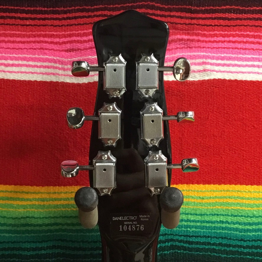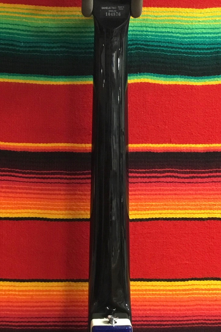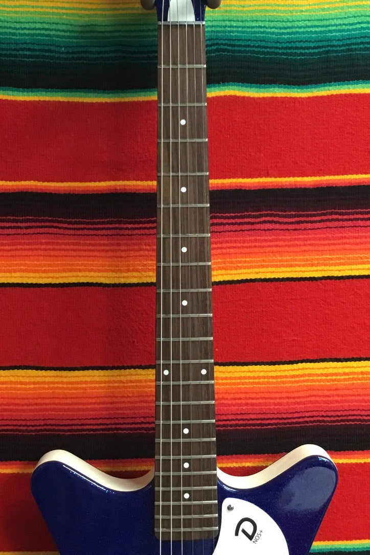 Danelectro 59M NOS+ in Blue Metalflake. Semi-hollow Spruce Body with Hardboard Top and Back. Maple Neck with C Shape. Pau Ferro Fretboard with White Dot Inlays. 1.650" Aluminum Nut. 14" Fretboard Radius. 25" Scale Length. 2x Danelectro NOS+ Single Coil Lipstick Pickups with Concentric Volume and Tone Controls. 3-way Selector Switch. Adjustable Wraparound Tailpiece. Comes with No Bag or Case.