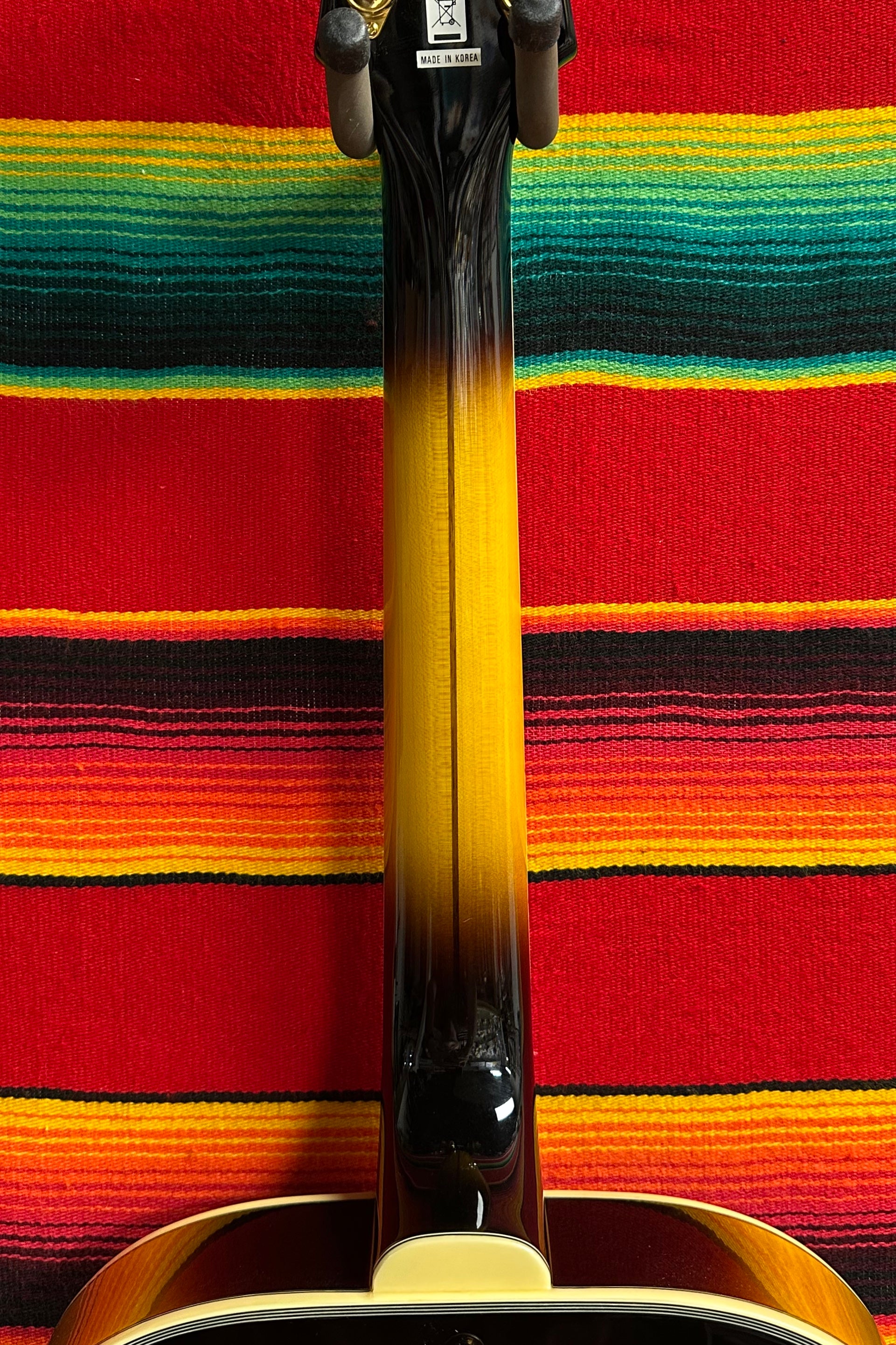 2015 D'Angelico EX Series Excel Style B in Sunburst. Fully Hollow 17" Archtop with Laminated Spruce Top. Laminated Maple Back and Sides. 3-piece Maple/Rosewood/Maple Neck with Bound Headstock and Medium C Profile. Bound Rosewood Fretboard with Pearl Block Inlays. Grover 150 Imperial Tuners. 1 11/16" Nut Width. 12" Fretboard Radius. 24.5" Scale Length. 1x Floating Pickguard Mounted Mini Humbucking Pickup with Master Volume and Tone Controls. Rosewood Floating Bridge. Tailpiece Changed to Epiphone Frenquensator Tailpiece. Comes with OHSC