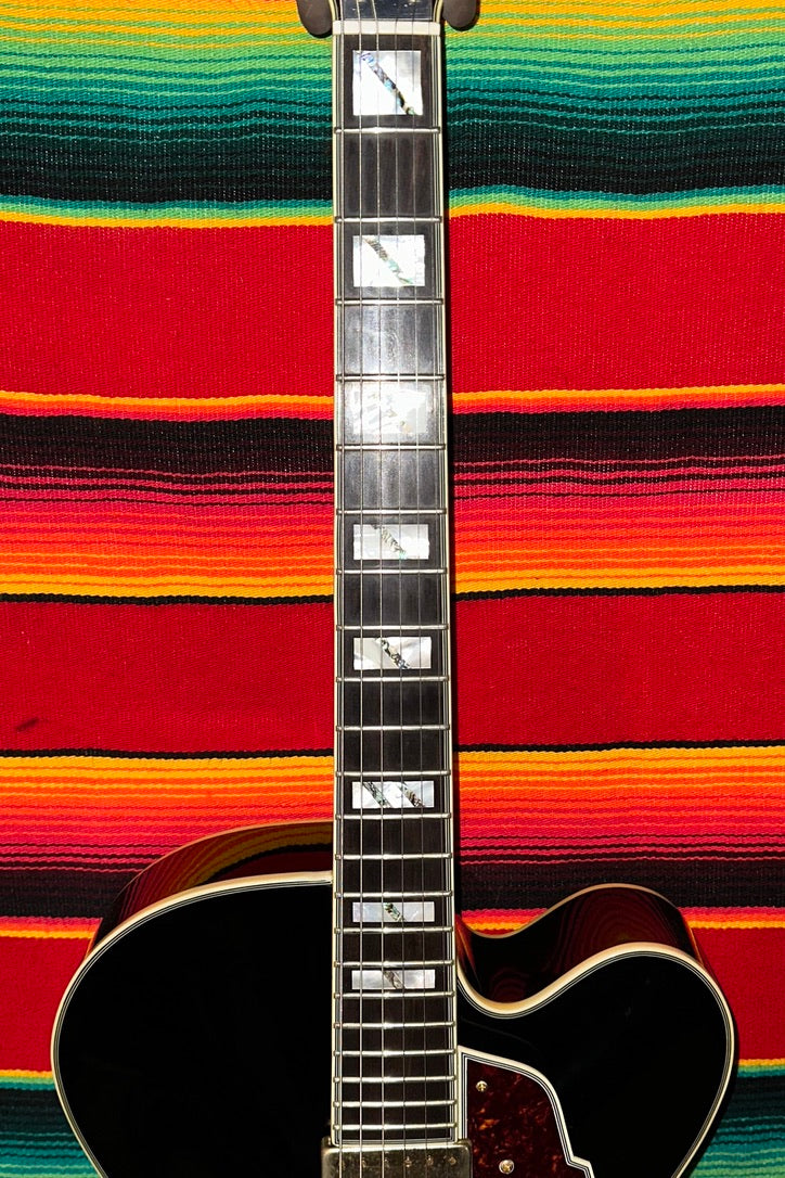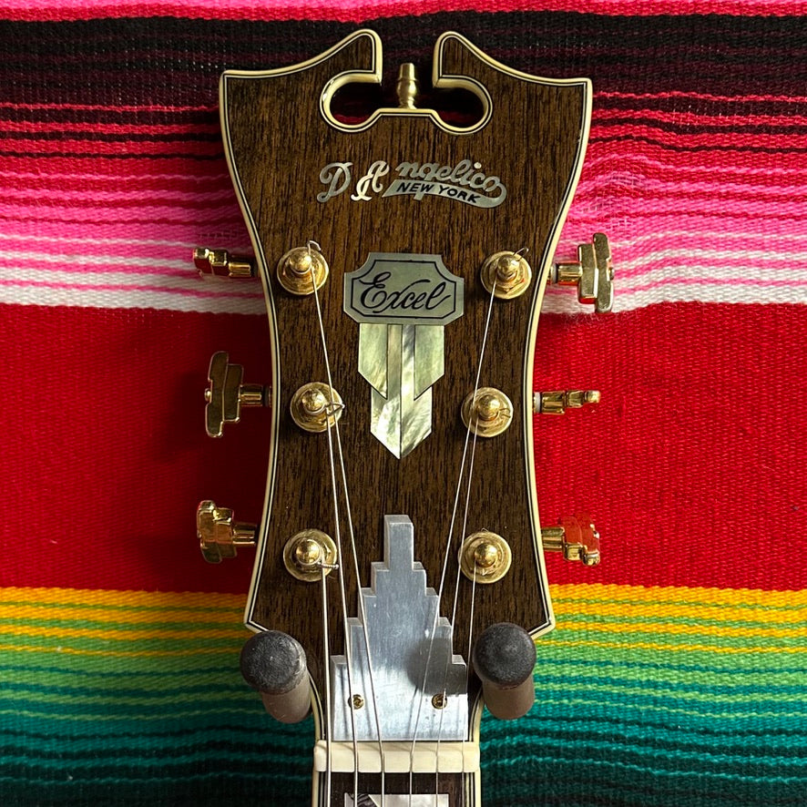 2006 D'Angelico Excel EXL-1 in Black. Fully Hollow 17" Archtop. Laminate Spruce Top. Laminated Maple Back and Sides. 3-Piece Maple/Walnut Set Neck with C Profile. Grover Imperial Tuners. Bound Ebony Fretboard with Mother of Pearl Split Block Inlays. 1.6875" Nut Width. 12" Fretboard Radius. 25.5" Scale Length. 1x Seymour Duncan Johnny Smith Floating Humbucking Pickup with Pickguard Mounted Volume and Tone Controls. Floating Ebony Bridge and Gold Trapeze Tailpiece. Comes with OHSC