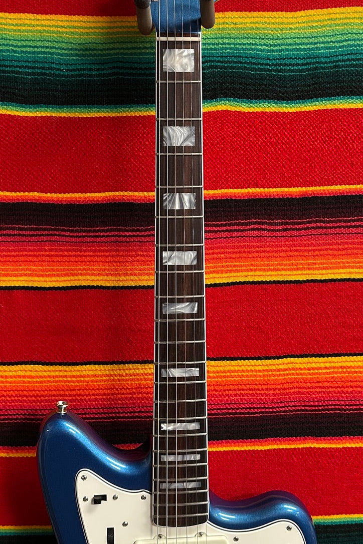 2024 Fender American Vintage II 1966 Jazzmaster in Lake Placid Blue. Alder Body. Maple Neck with Matching Headstock and 1966 C Profile. Bound Round-Laminated Rosewood Fretboard with Pearloid Block Inlays. 1.650" Bone Nut. 7.25" Fretboard Radius. 25.5" Scale Length. 2x Fender Pure Vintage '66 Jazzmaster Pickups with Master Volume and Master Tone Controls and 3-way Selector Switch. Rhythm Circuit with Neck Pickup Volume and Tone Thumbwheels and Lead/Rhythm Slider Switch. Fender Pure Vintage Jazzmaster Bridge with Threaded Steel Saddles. Fender Pure Vintage Floating Tremolo with Trem-Lok. Comes with OHSC and Extras