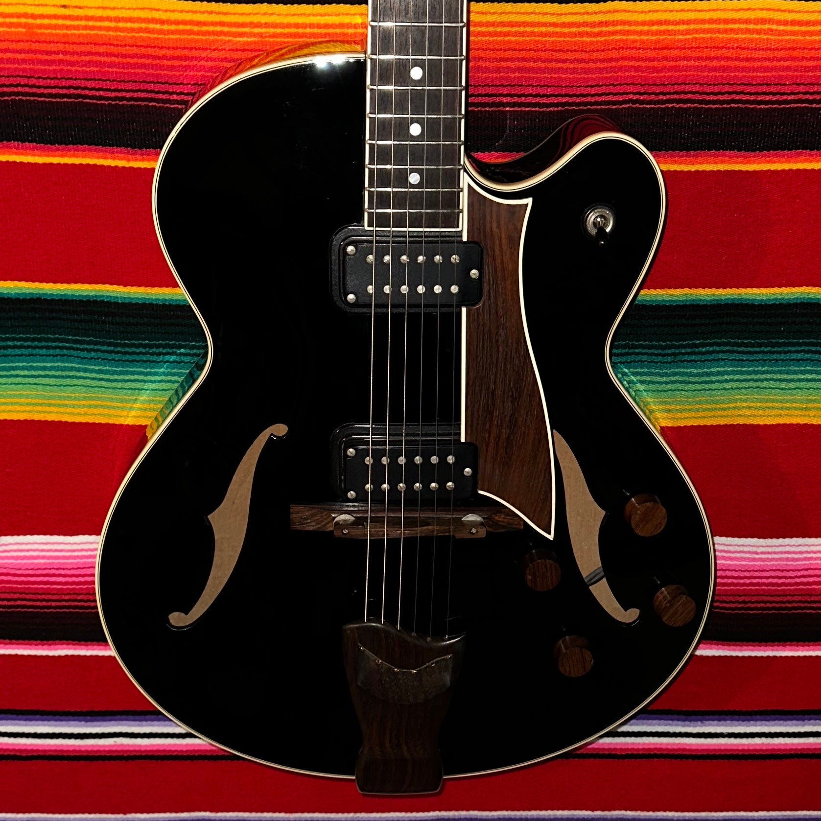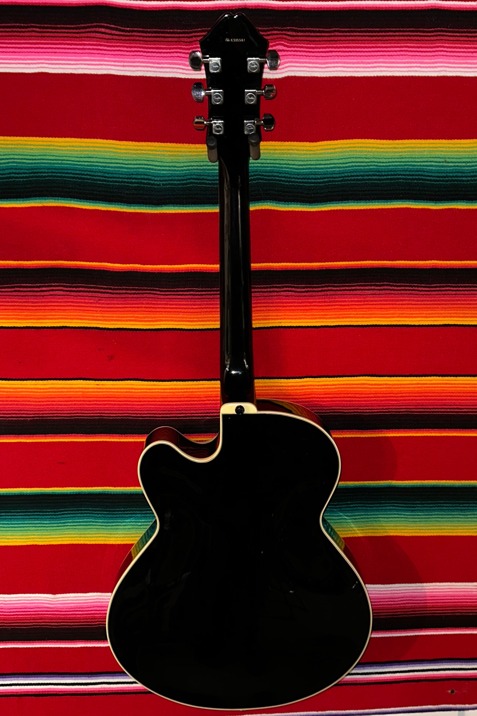 1985 Fender D'Aquisto Standard in Black. Made in Japan at FujiGen. 16" Archtop with Fully Hollow Laminated Maple Body. 3-piece Maple Neck with Thin C Profile. Bound Rosewood Fretboard with Mother of Pearl Dot Inlays. Fender Sealed Tuners. 1 11/16" Nut Width. 12" Fretboard Radius. 24.75" Scale Length. 2x Schaller Humbucking Pickups with Individual Volume and Tone Controls. 3-way Selector Switch. Floating Adjustable Rosewood Bridge and Rosewood Tailpiece. Bound Rosewood Pickguard and Rosewood Control Knobs. Comes with OHSC