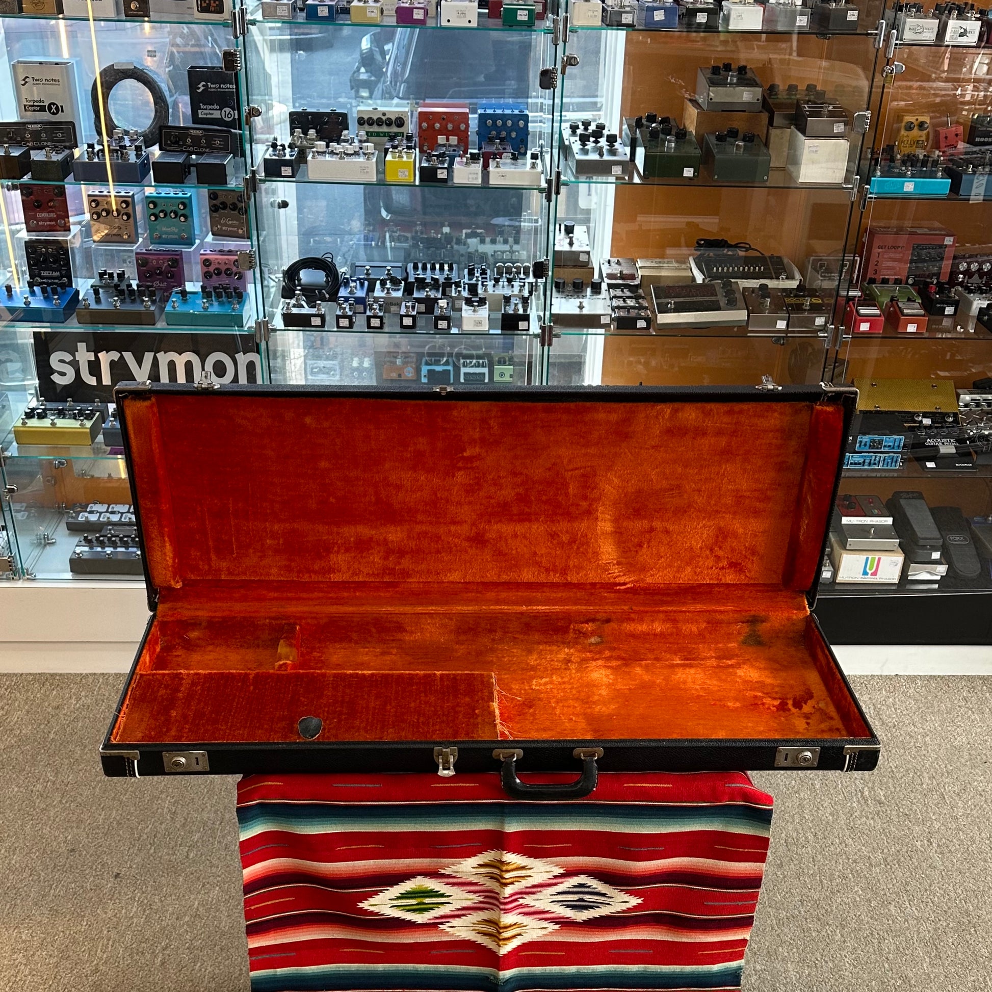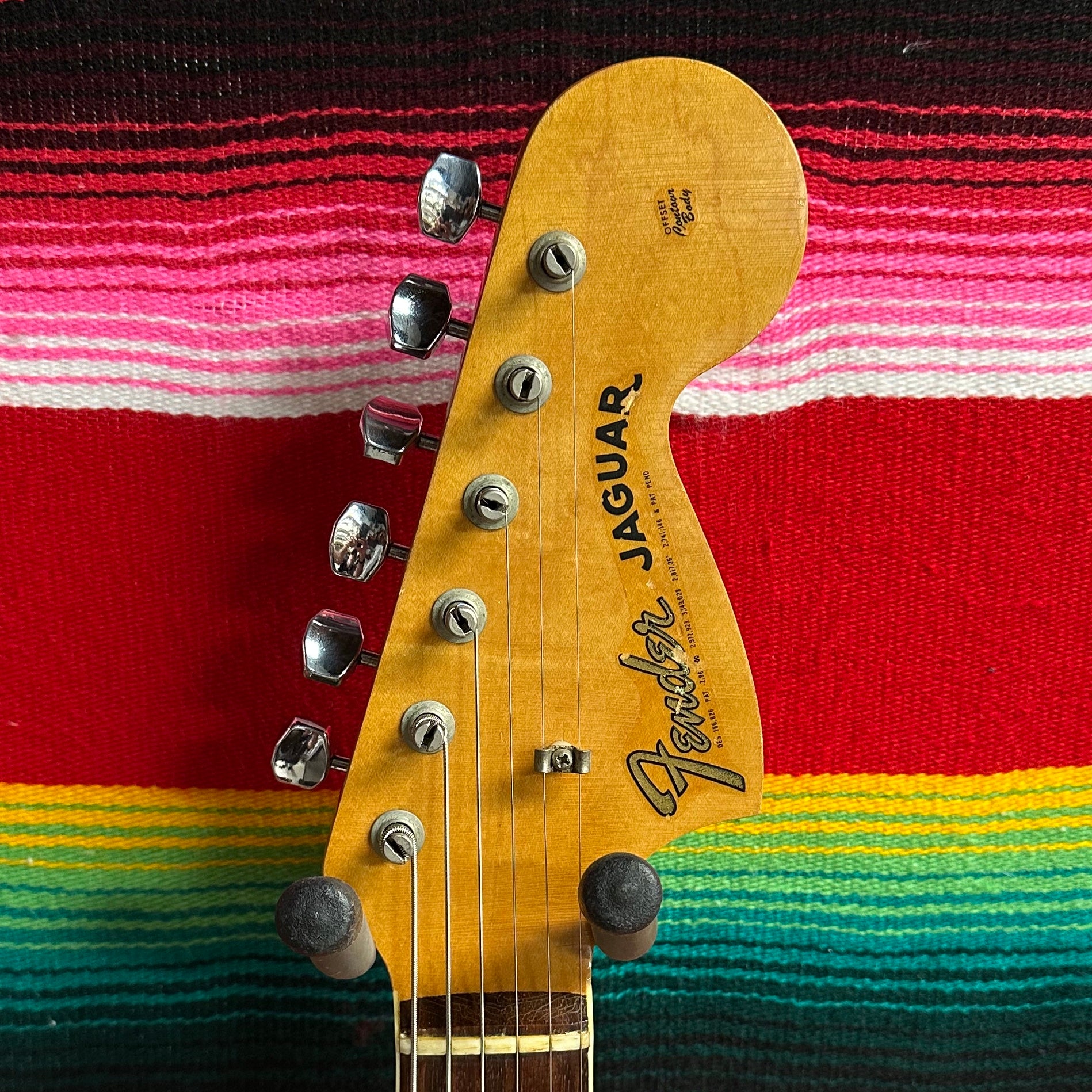1966 Fender Jaguar in Sunburst. Alder Body. Maple Neck with C Profile. Bound Brazilian Rosewood Fretboard with Pearl Dot Inlays. "F" Logo Tuners. 1.625" Nut Width. 7.25" Fretboard Radius. 24" Scale Length. 2x Single Coil Jaguar Pickups with Master Volume and Tone Controls. Lead Circuit with Individual Pickup On/Off Switches, and Mid Cut Switch. Rhythm Circuit with Lead/Rhythm Switch and Neck Pickup Volume and Tone Thumbwheel Controls. Muted Bridge and Fender Floating Tremolo. Original Pickguard with Repaired Lower Crack Re-installed. One Ground Wire Resoldered. Under Pickguard Shielding Plate Reinstalled with New Scotch Tape. Comes with OHSC
