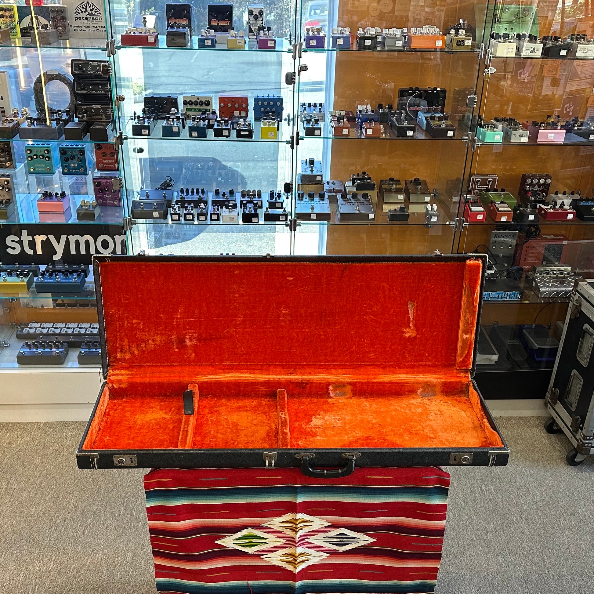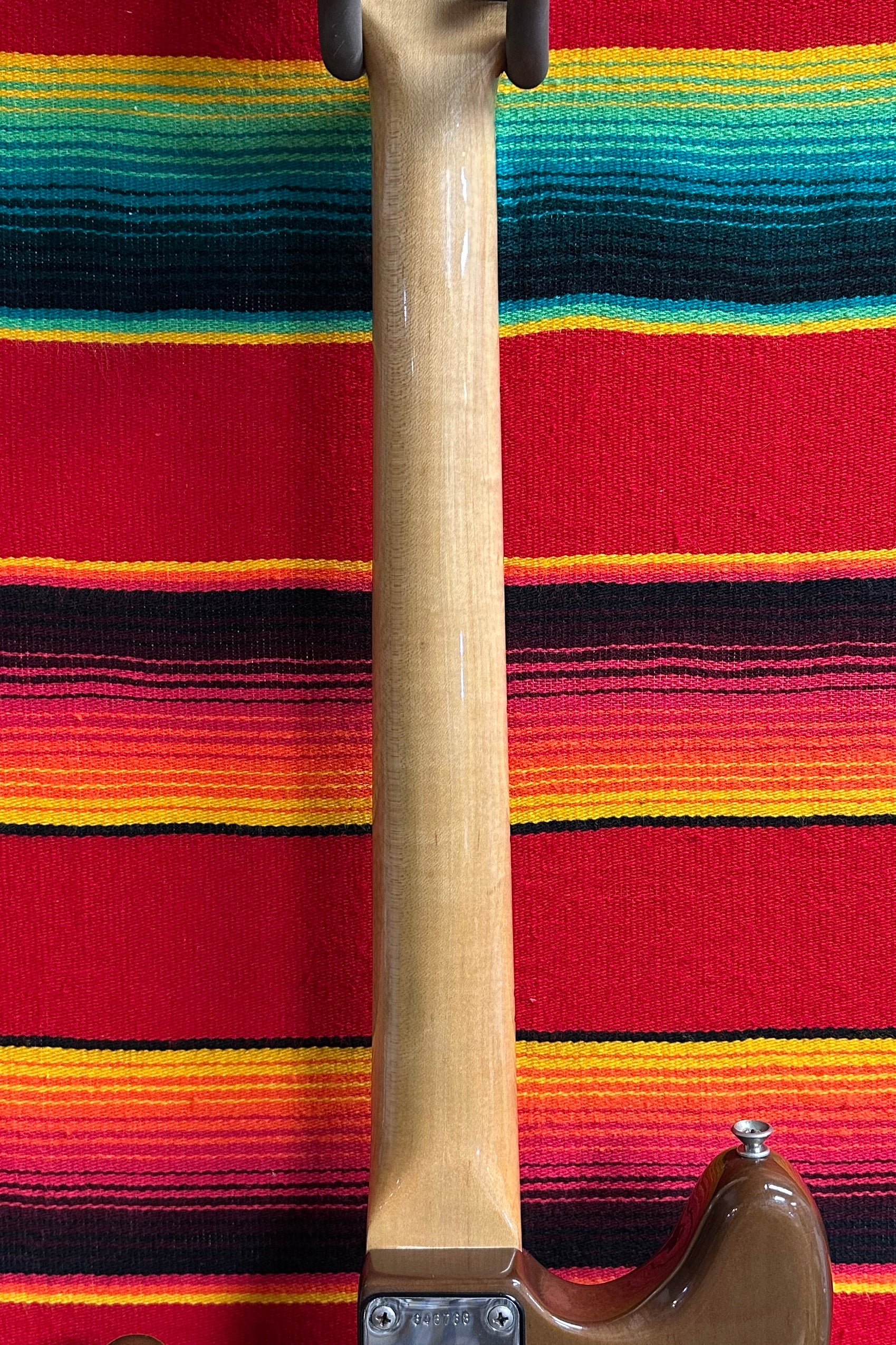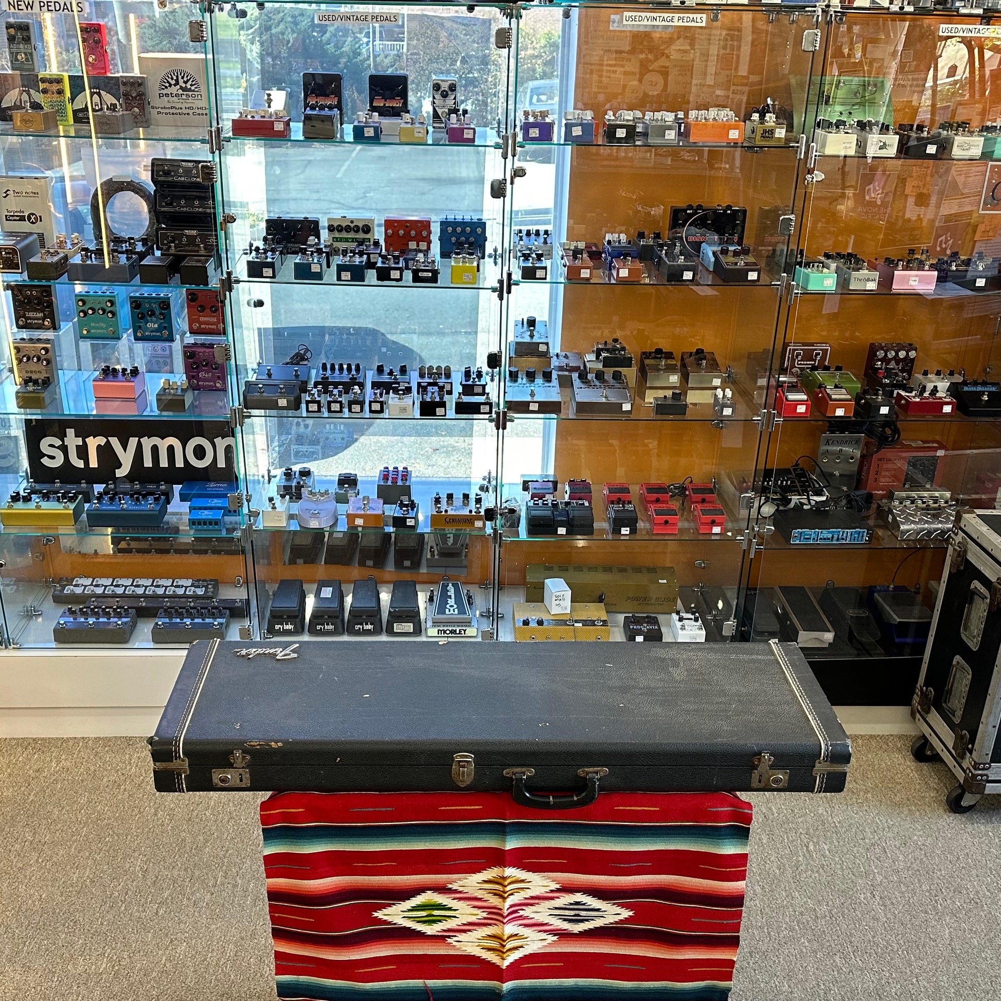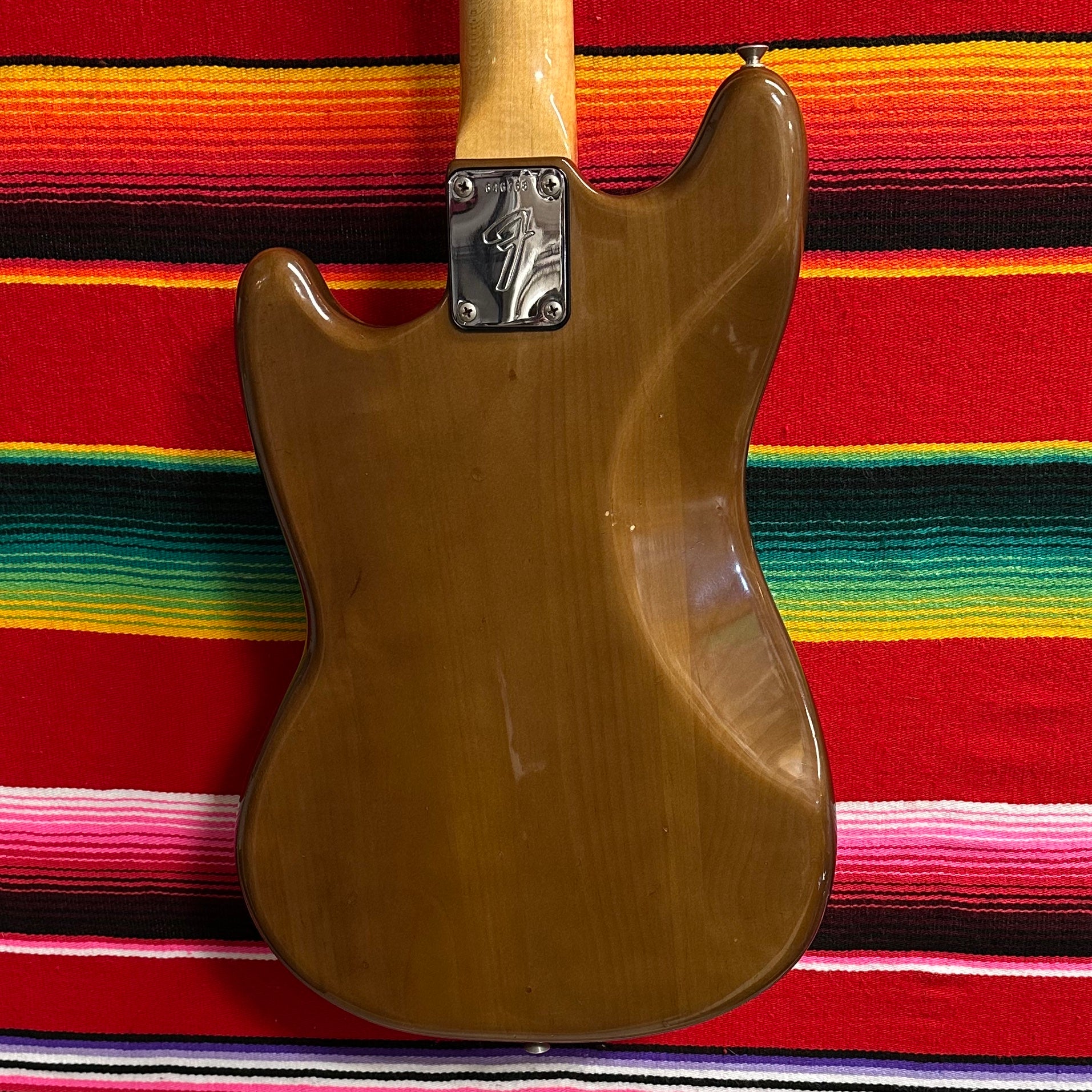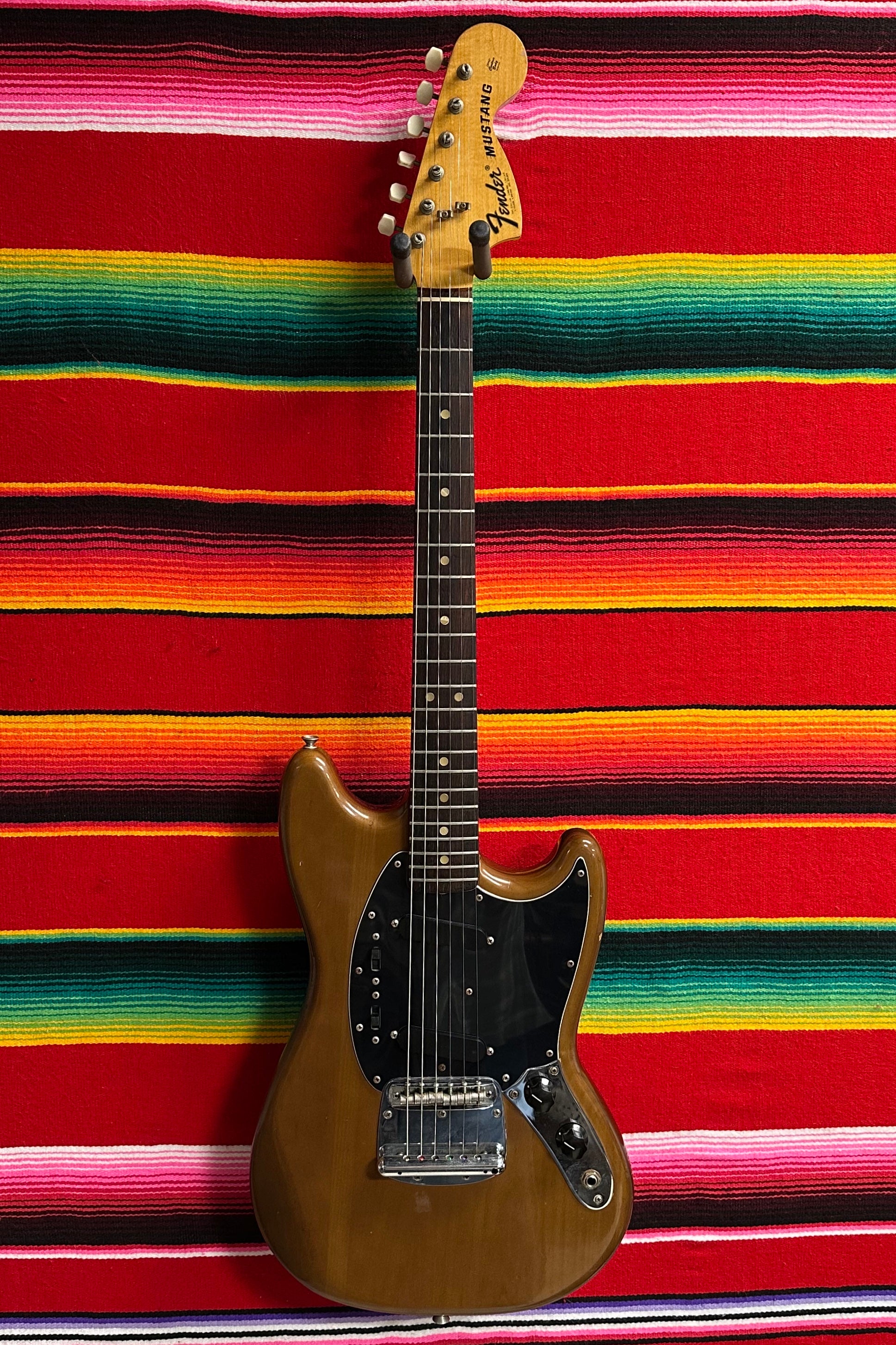 1975 Fender Mustang in Walnut. 5-piece Poplar Body. Maple Neck with C Profile. Unbound Laminate Rosewood Fretboard with Pearloid Dot Inlays. "F" Stamped Tuners. 1.625" Nut Width. 7.25" Fretboard Radius. 24" Scale Length. 2x Single Coil Mustang Pickups with Individual On/Off/Phase Switches. Master Volume and Master Tone Controls. Fender Dynamic Vibrato and 6 Saddle Bridge. Comes with OHSC