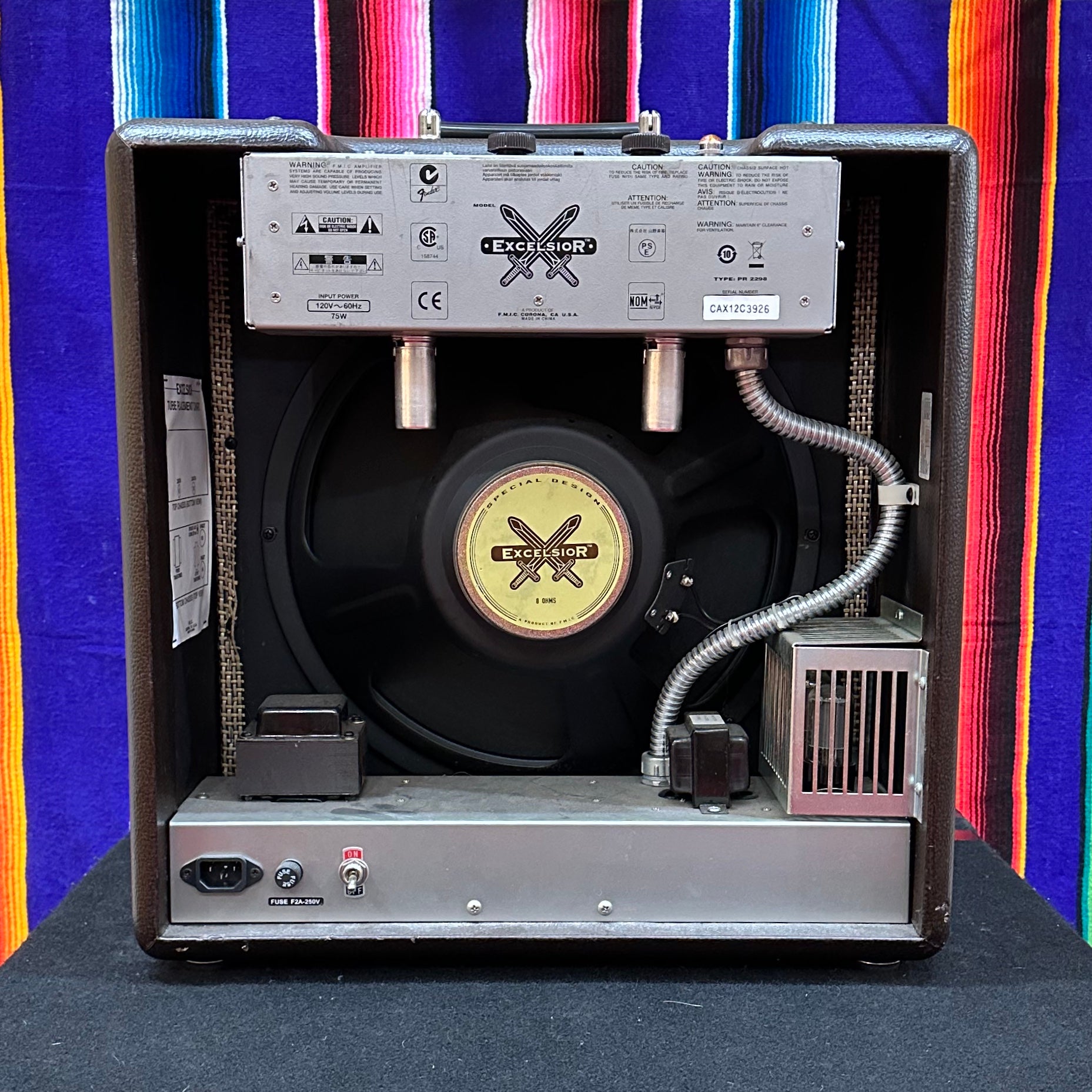 2012 Fender Pawn Shop Excelsior 1x15 Combo. 13 Watts with 2x 6V6 and 2x 12AX7. Guitar, Mic, and Accordian Inputs. Volume and Tremolo Controls. Bright/Dark Switch. 1x 15" Fender Excelsior Special Design Speaker.