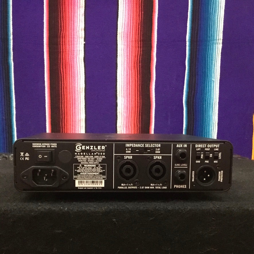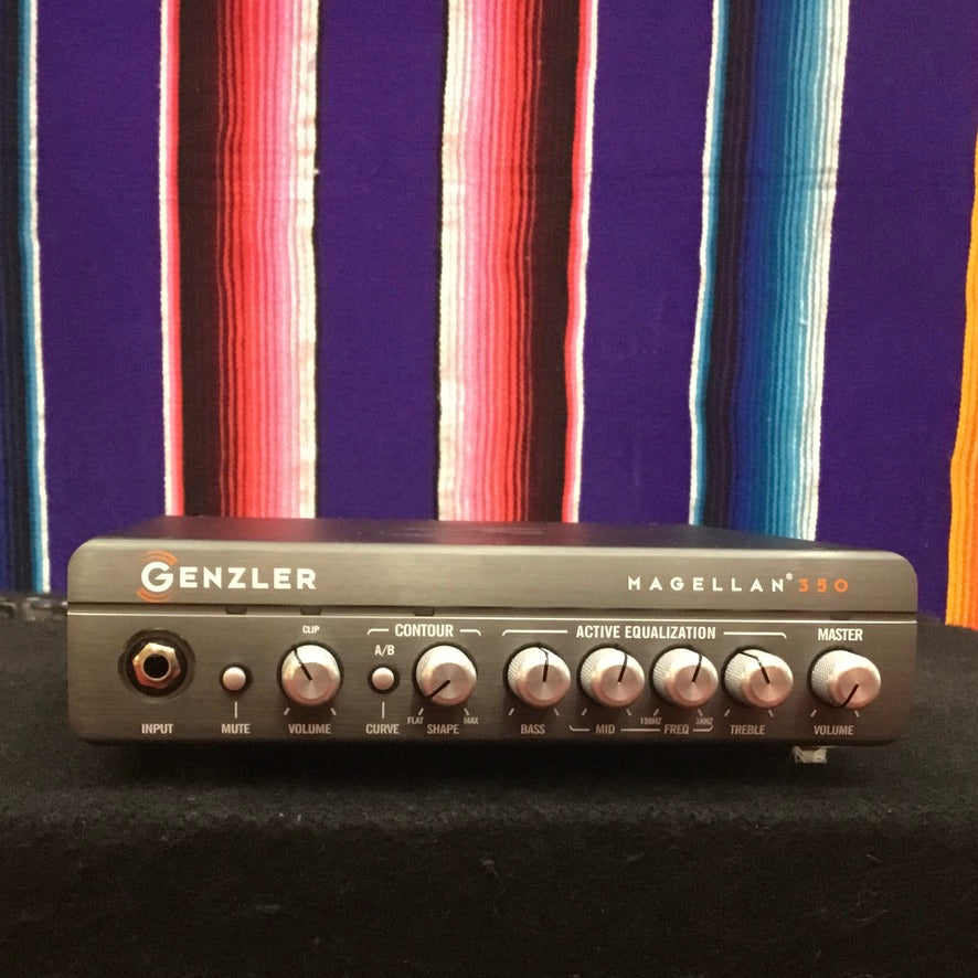 Genzler Amplification Magellan 350 Watt Amp Head. 350 Watts Class D at 2.67 or 4 Ohms, 175 watts at 8 Ohms. Volume Control, and Contour with A/B Curve Switch and Shape Control. 3-band Active EQ with Parametric Mid Control. Master Volume Control. Signal Mute Switch. XLR Direct Out. Headphone Input. Aux Line Level Input. Limited 3 Year Warranty, IEC Cable and Owners Manual.