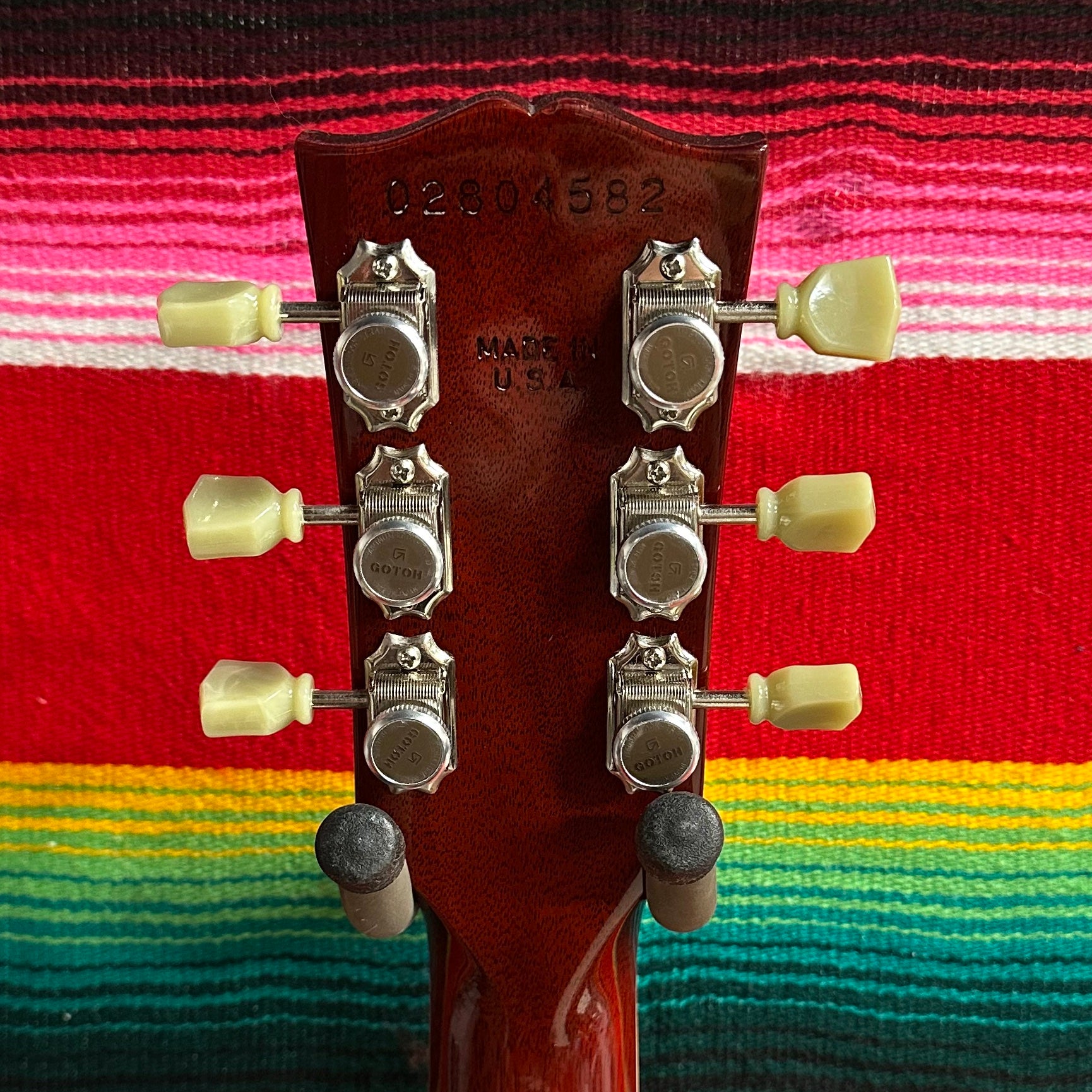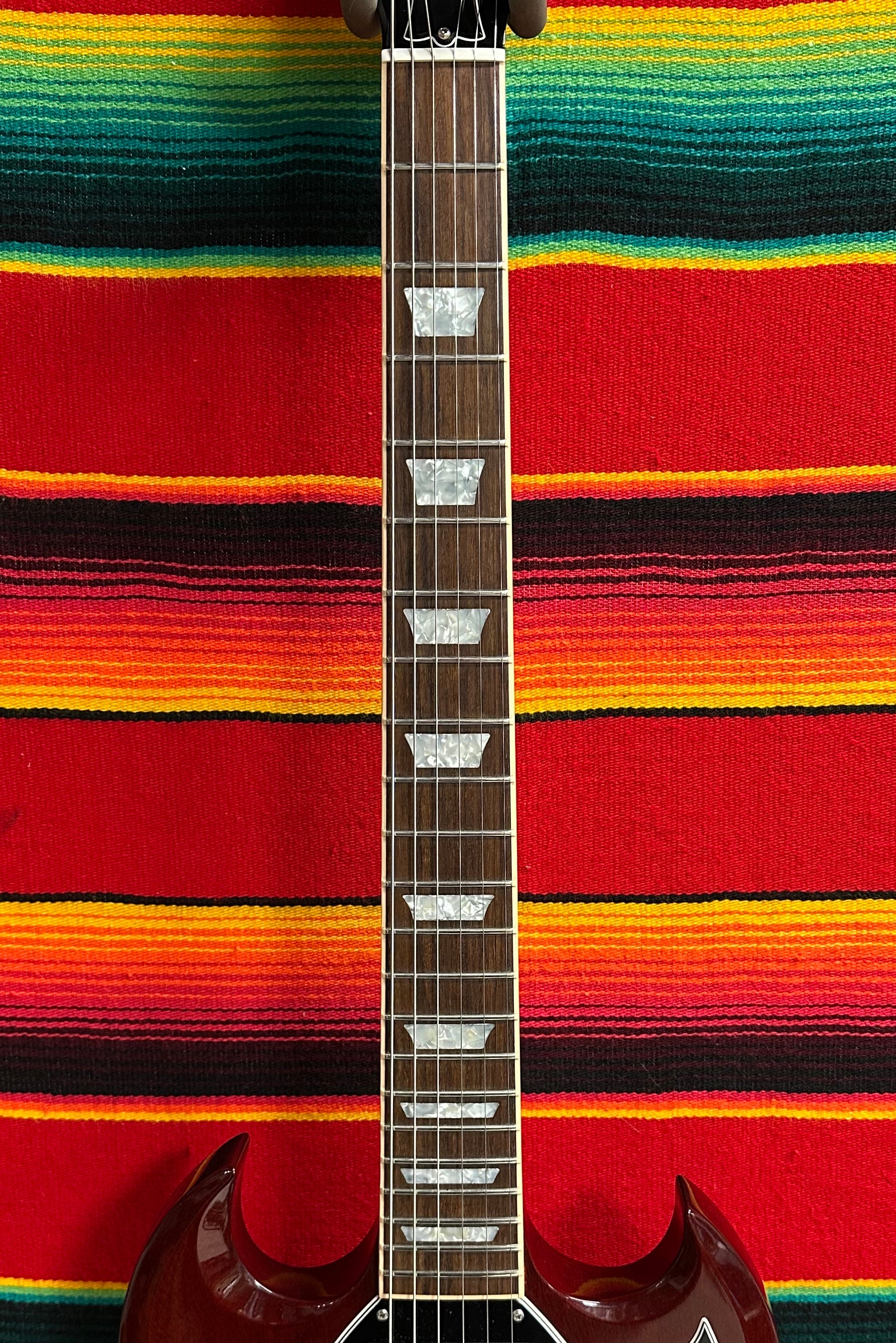 2004 Gibson SG Standard in Cherry. Solid Mahogany Body. Mahogany Neck with Medium C Profile. Bound Rosewood Fretboard with Trapazoid Inlays. Tuners Changed to Gotoh SD90-SL MG-T Locking Tuners with Keystone Buttons. 1 11/16" Nut Width. 12" Fretboard Radius. 24.75" Scale Length. Gibson 490R and 498T Humbucking Pickups with Individual Volume and Tone Controls. 3-way Selector Switch. Bridge Changed to Schaller STM Roller Bridge and Added Bigsby B7 Vibrato Tailpiece. Comes with OHSC
