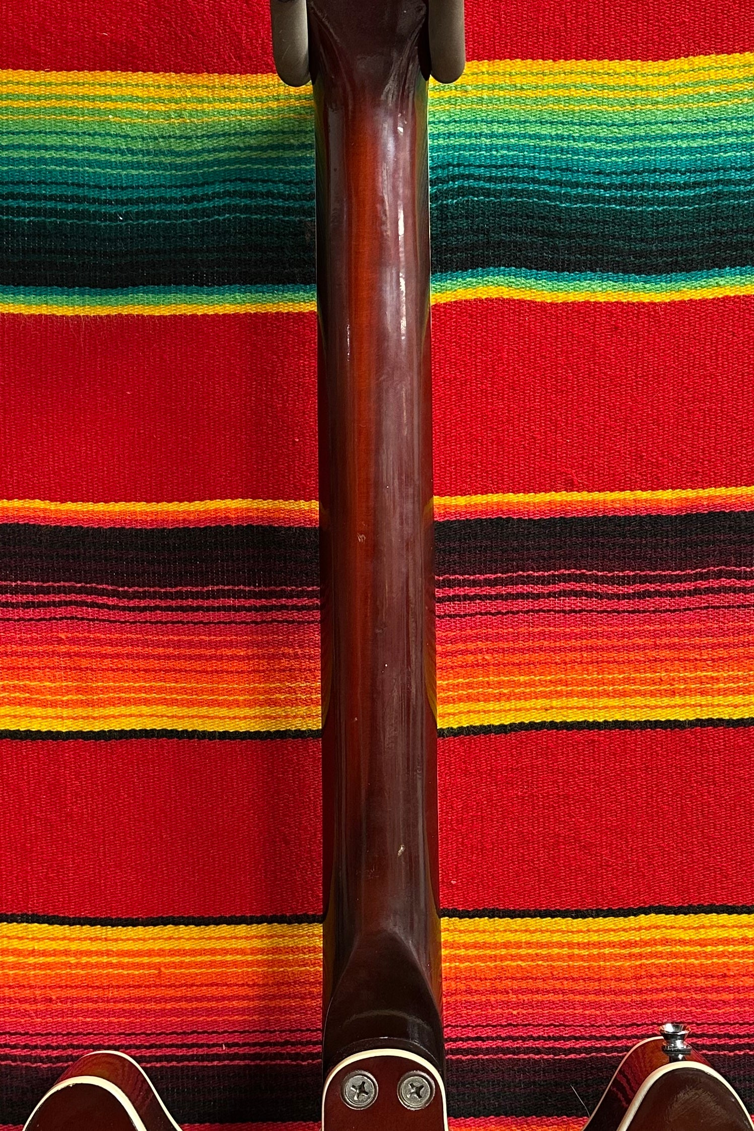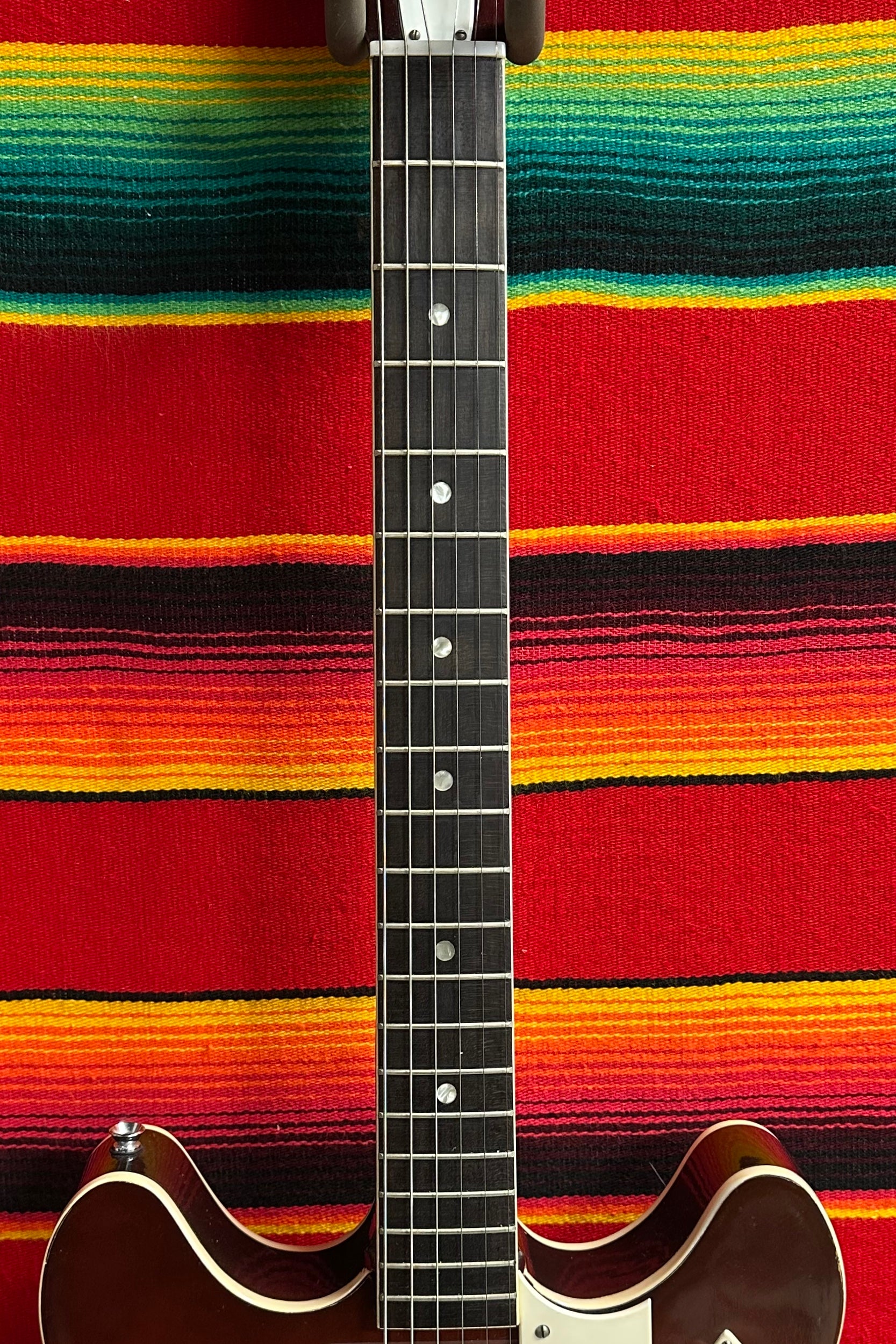 1968 Harmony H-56/1 Rocket in Red Burst. Fully Hollow Laminated Maple Body. Bolt-on Maple Neck with C Profile. Bound Ebonized Rosewood Fretboard with Pearl Dot Inlays. 1 11/16" Nut Width. 12" Fretboard Radius. 24.25" Scale Length. 2x DeArmond Golden Tone Single Coil Pickups with Individual Volume and Tone Controls. 3-way Selector Switch. Floating Rosewood Bridge and Trapeze Tailpiece. No Bag or Case.