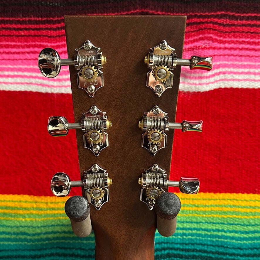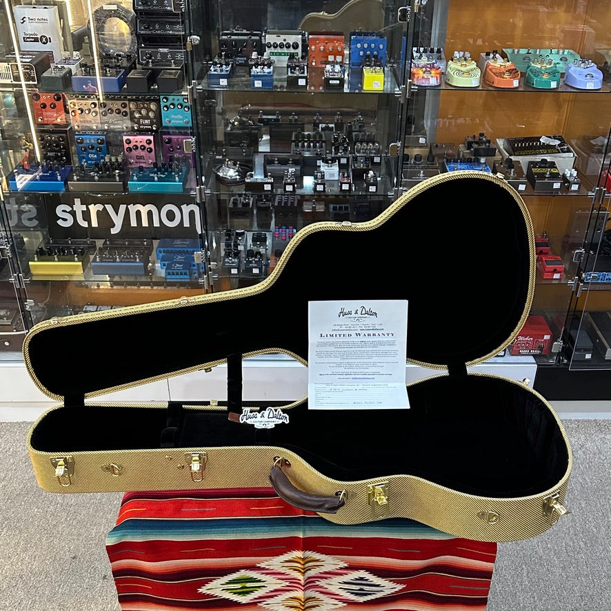 2025 Huss & Dalton T-0014 Custom in Natural. Carpathian Spruce Top with 4-ply Perfling. Sinker Mahogany Back and Sides. Bloodwood Body Binding. Mahogany Neck with C Profile. Unbound Ebony Fretboard with Mother of Pearl Long Pattern Dot Inlays. Nickel Open Gear Tuners with Nickel Buttons. 1.75" Bone Nut. 16" Fretboard Radius. 24.9" Scale Length. Ebony Belly Bridge with Compensated Bone Saddle. Ebony Bridge Pins with Mother of Pearl Dot Inlays. Comes with OHSC and Factory Warranty