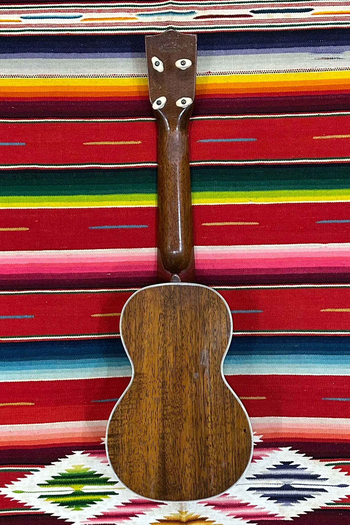1929-32 Martin Style 3K Koa Soprano Ukulele. Solid Koa Body with 7-ply Top Binding, Lower Top Celluloid Inlay, and 3-ply Back Binding. 17 Fret Mahogany Neck with 12 Frets to the Body. Ebony Fretboard with Small Pearl Paired-Diamond Inlays at 5th, 7th, and 10th Frets, and 3 Line Inlay. Nickel Friction Tuners with White Buttons. Brazilian Rosewood Bridge. 2 Repaired and Cleated Back Cracks. Shimmed Nut. Changed Saddle. Comes with OHSC