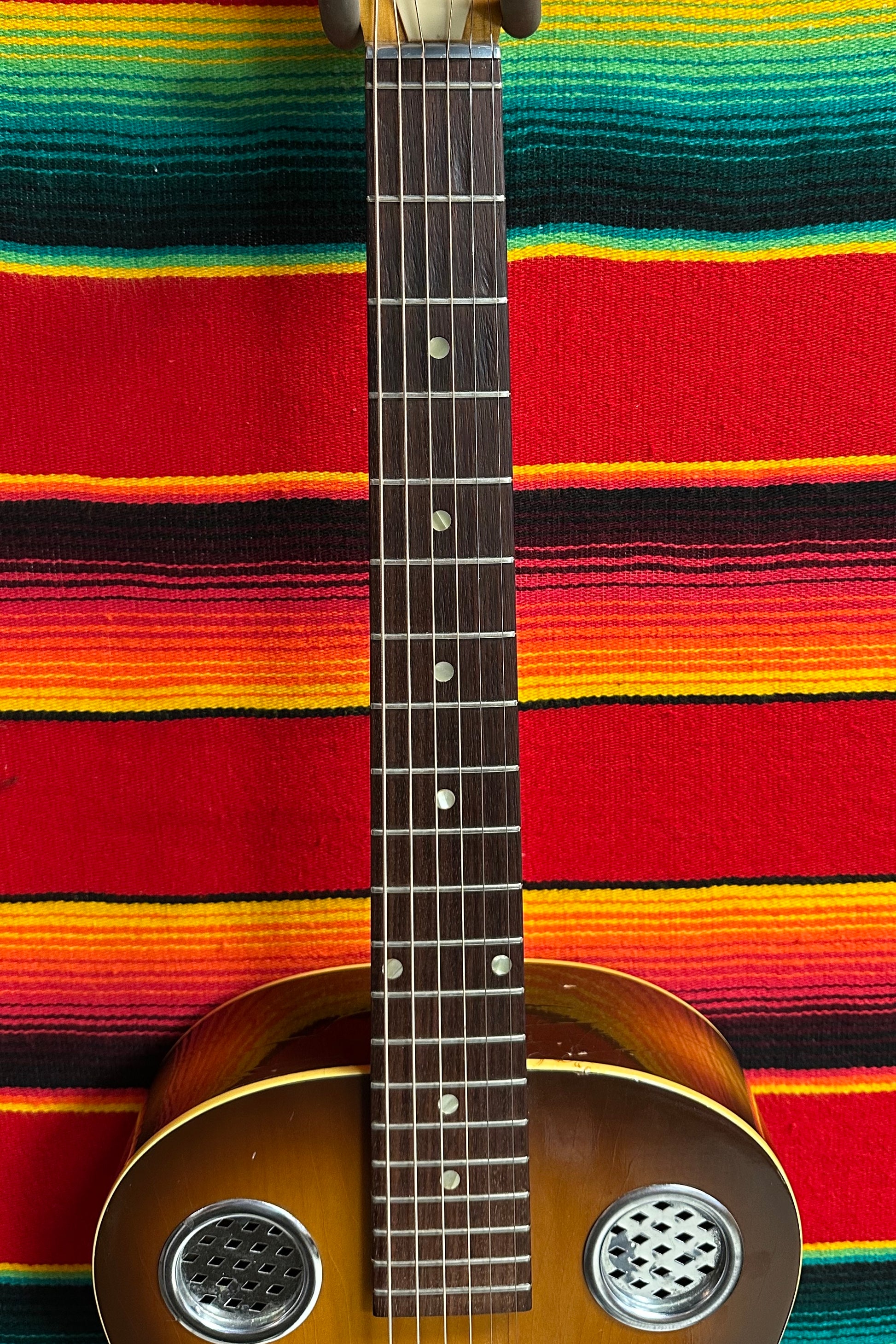 1966-67 Mosrite/Dobro Model D-40 Texarkana in Mahogany Burst. Laminated Maple Body. Maple Adjustable Tilt Neck with Slim Profile. East Indian Rosewood Fretboard with Pearl Dot Inlays. 3 On a Plate Open Gear Tuners with White Buttons. 1.6875" Aluminum Nut. 16" Fretboard Radius. 24 5/8" Scale Length. 10.5" Cone and 2x Diamond Screened Soundholes. Regal-style Tailpiece. No Bag or Case