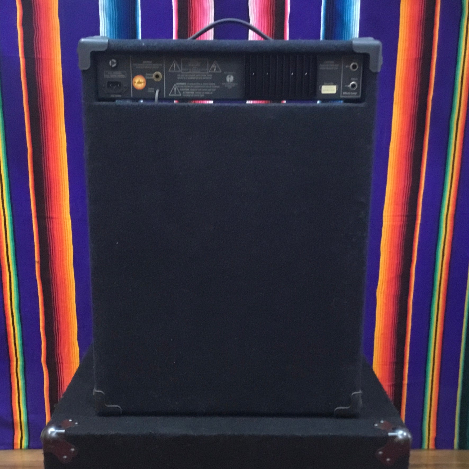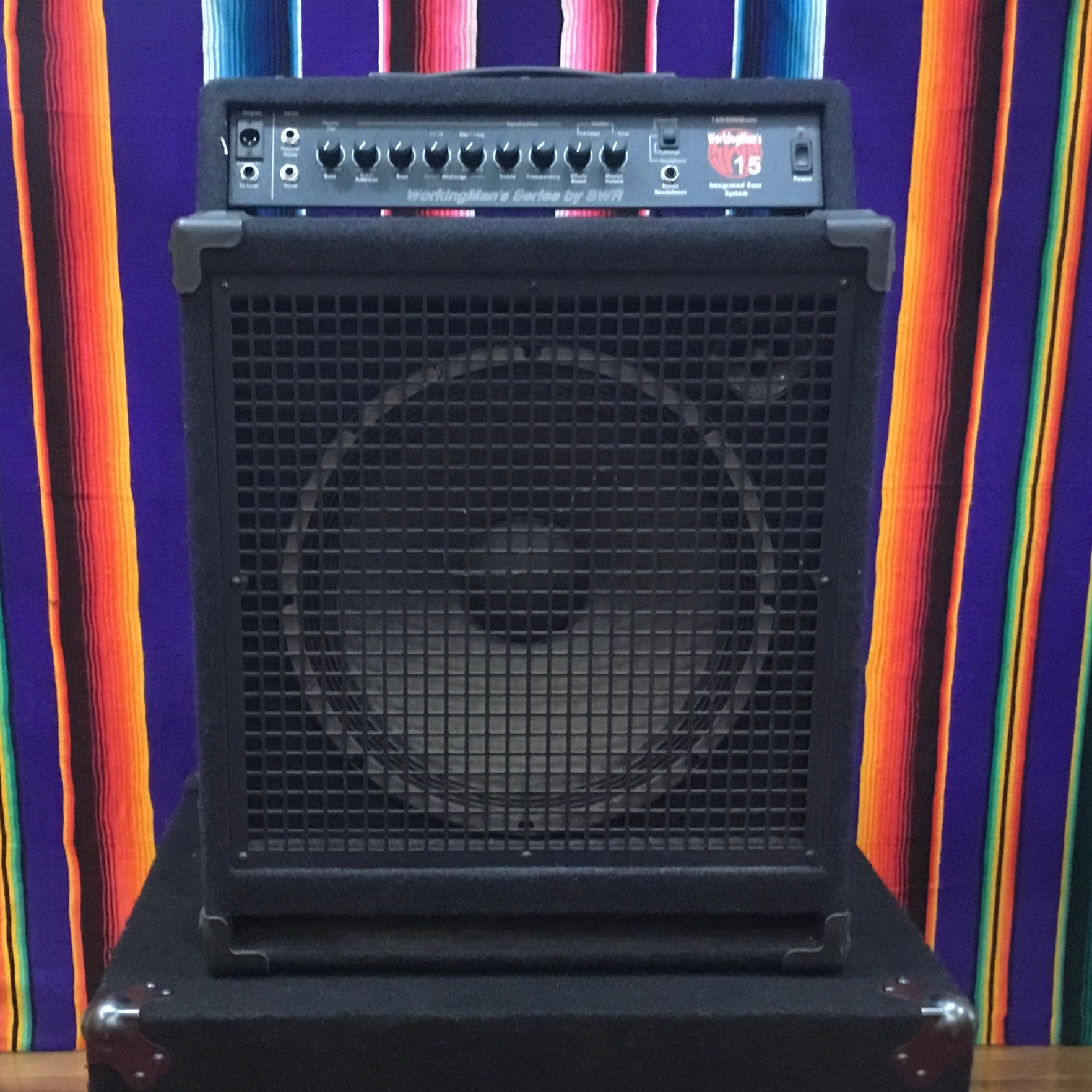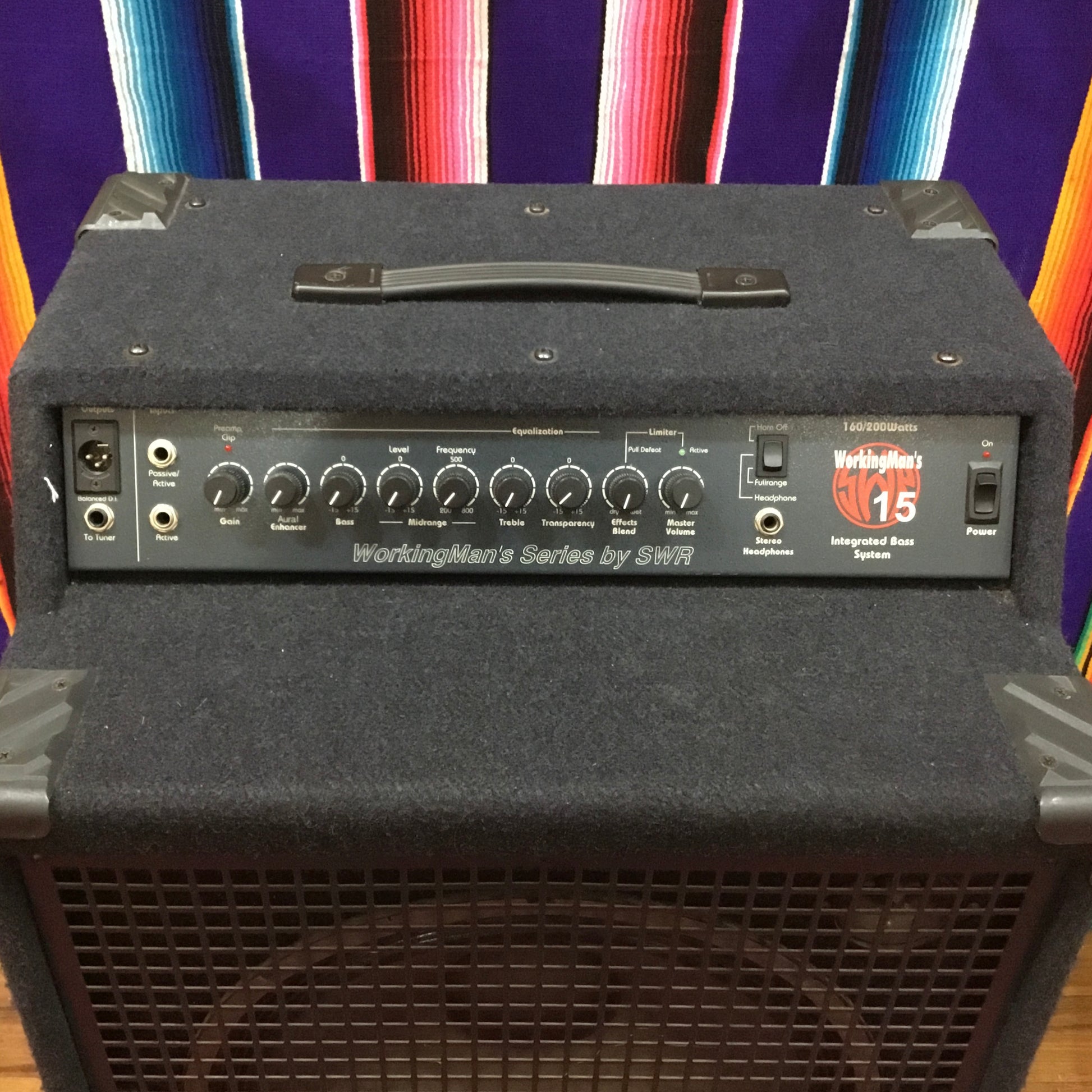 1999 SWR Workingman 15. 160 watts Solid State. Passive and Active Inputs, Gain, Aural Enhancer, 4-band EQ, Transparancy, Effects Blend, and Master Volume Controls. Stereo Headphone Input. Balanced DI XLR Out. 1x 15" Speaker