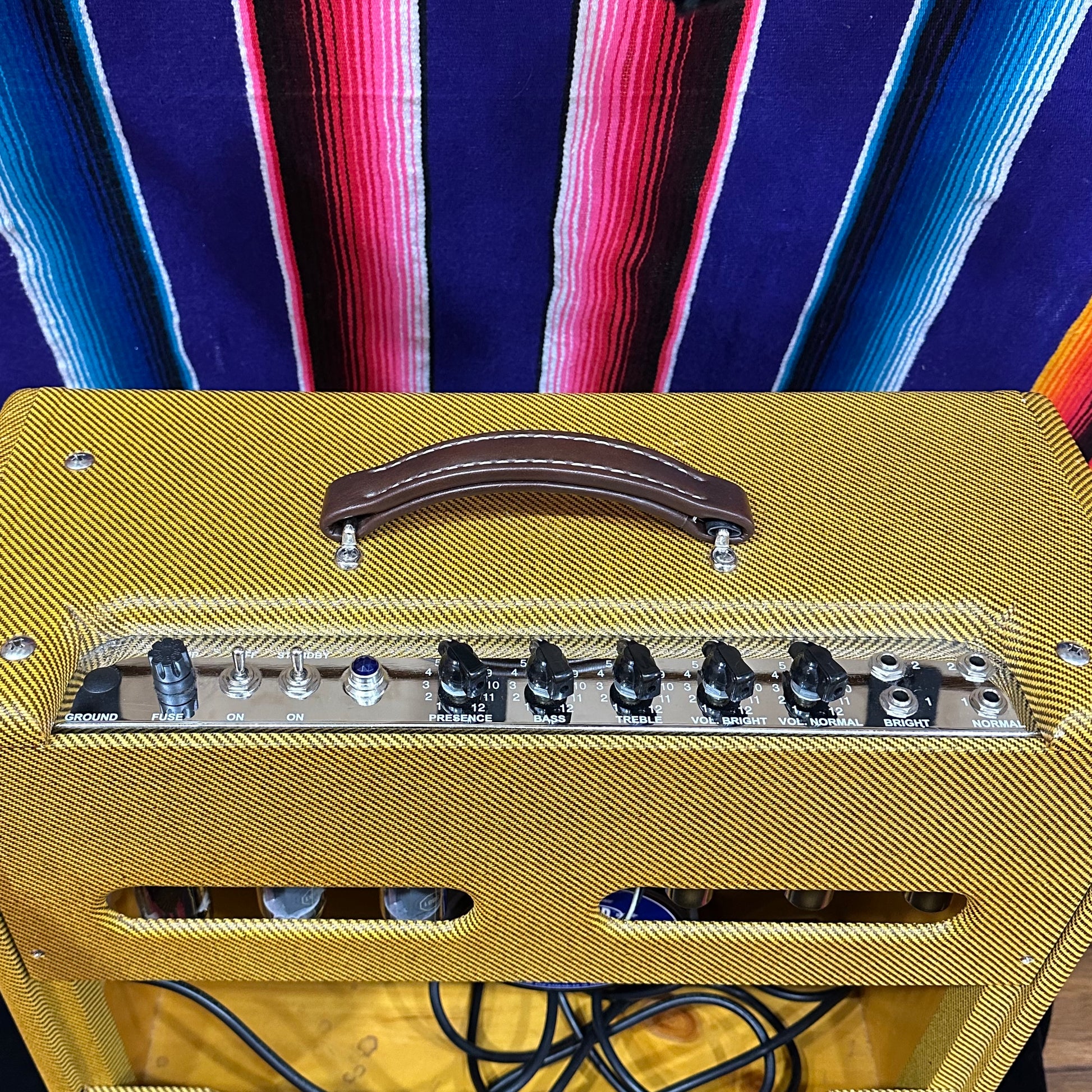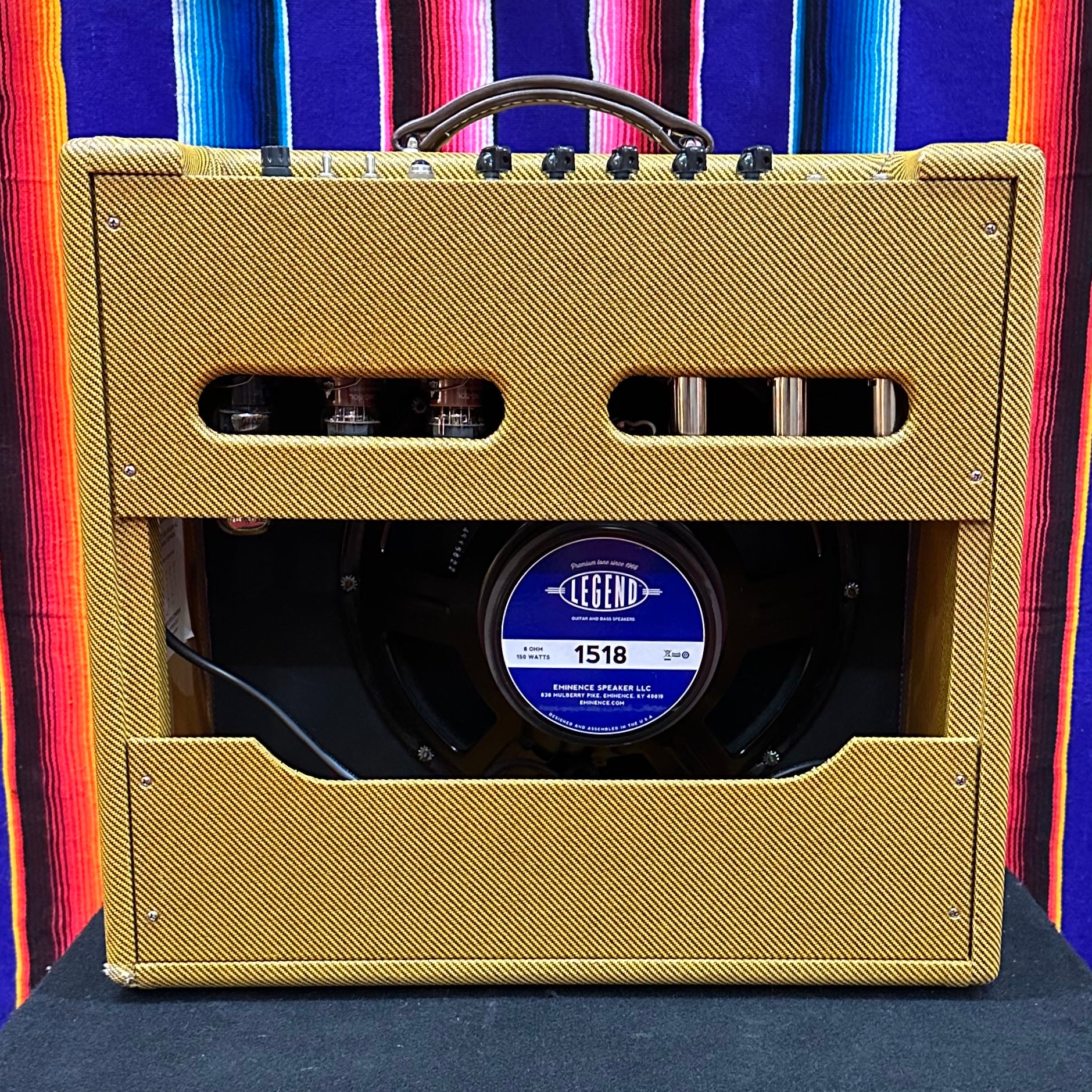 2010s Victoria 35115-T Tweed. Handwired Clone of the Fender 5E5A Pro. 28 Watts with 1x 5U4GB, 2x 6L6GC, 2x 12AX7, 1x 12AY7. Normal and Bright Channels with 2 Inputs and Individual Volume Controls. Master Treble, Bass, and Presence Controls. Speaker Changed to 1x Eminence Legend 1518 15" Speaker. Comes with Original Weber 15A150 15" Alnico Speaker