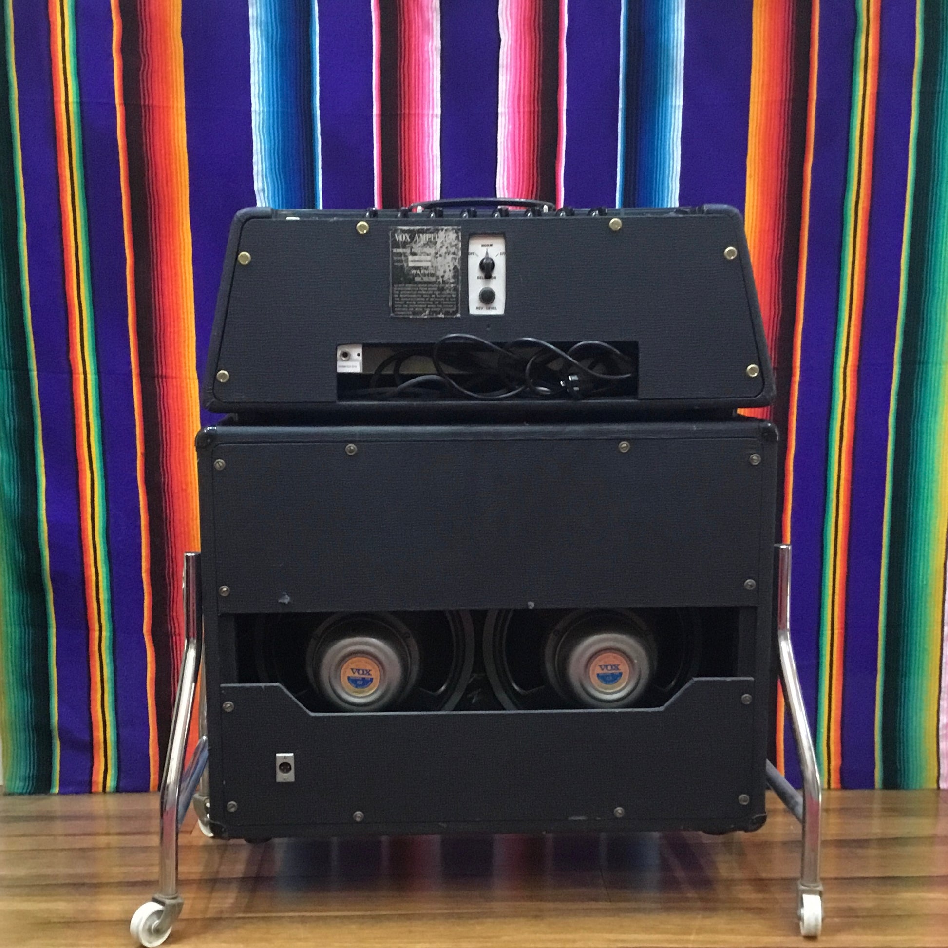 1964 Vox AC30 Super Reverb Twin Top Boost. Made by JMI in April 1964. Previously Serviced By Alessandro Amps. 30 Watts with 1x GZ34, 4x EL84, 5x ECC83/12AX7, and 1x ECC82/12AU7. Vib-Trem, Normal, and Brilliant Channels with Individual Volume Controls. Treble, Bass, and Cut Controls. Speed and Vib-Trem Vibrato Controls. Factory Top Boost. 2x12 Cabinet with 2x Celestion/Vox Silver Bulldog 12" Speakers and Swivel Trolley. Added 3-prong Power Cable and Modified Footswitch Jack