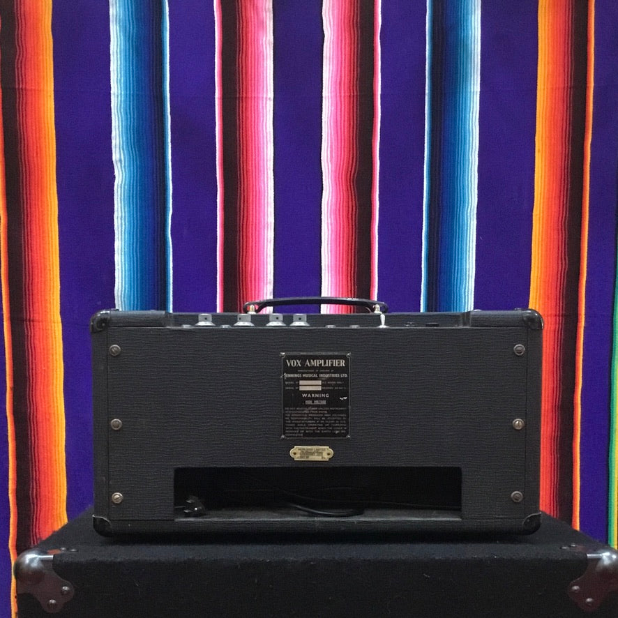 1964-1965 Vox Reverberation Unit. Tube Reverb Made by Jennings Musical Industries. Black Basket Weave Vinyl Cabinet with Gray Control Panel. Two Channels with Length and Level Controls. Added Three-Prong Cable.