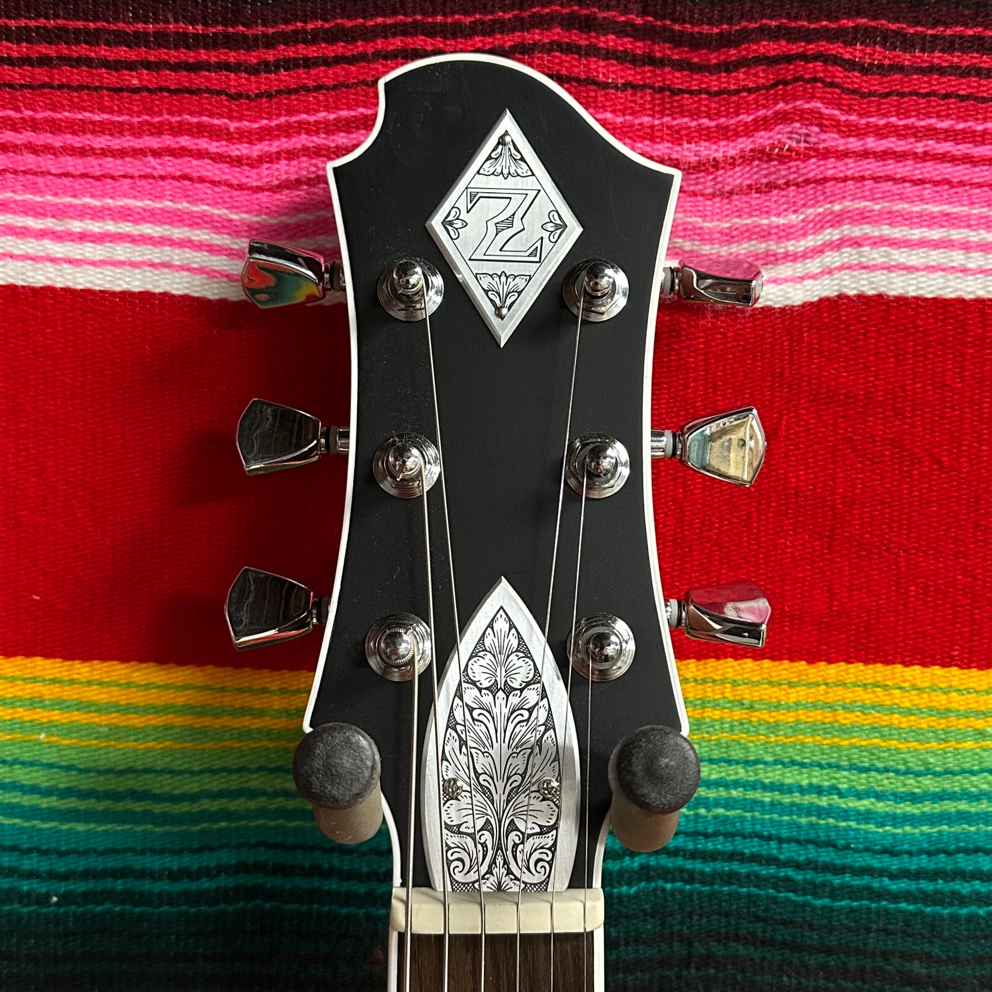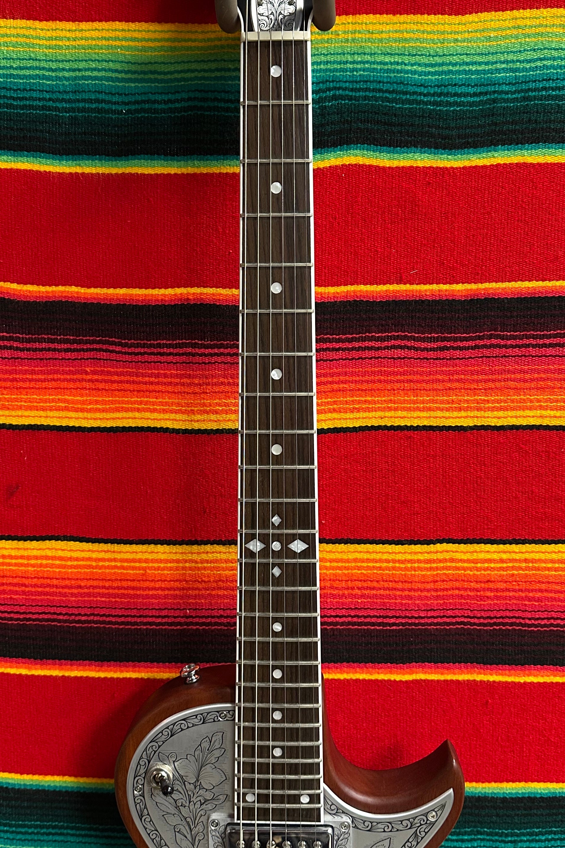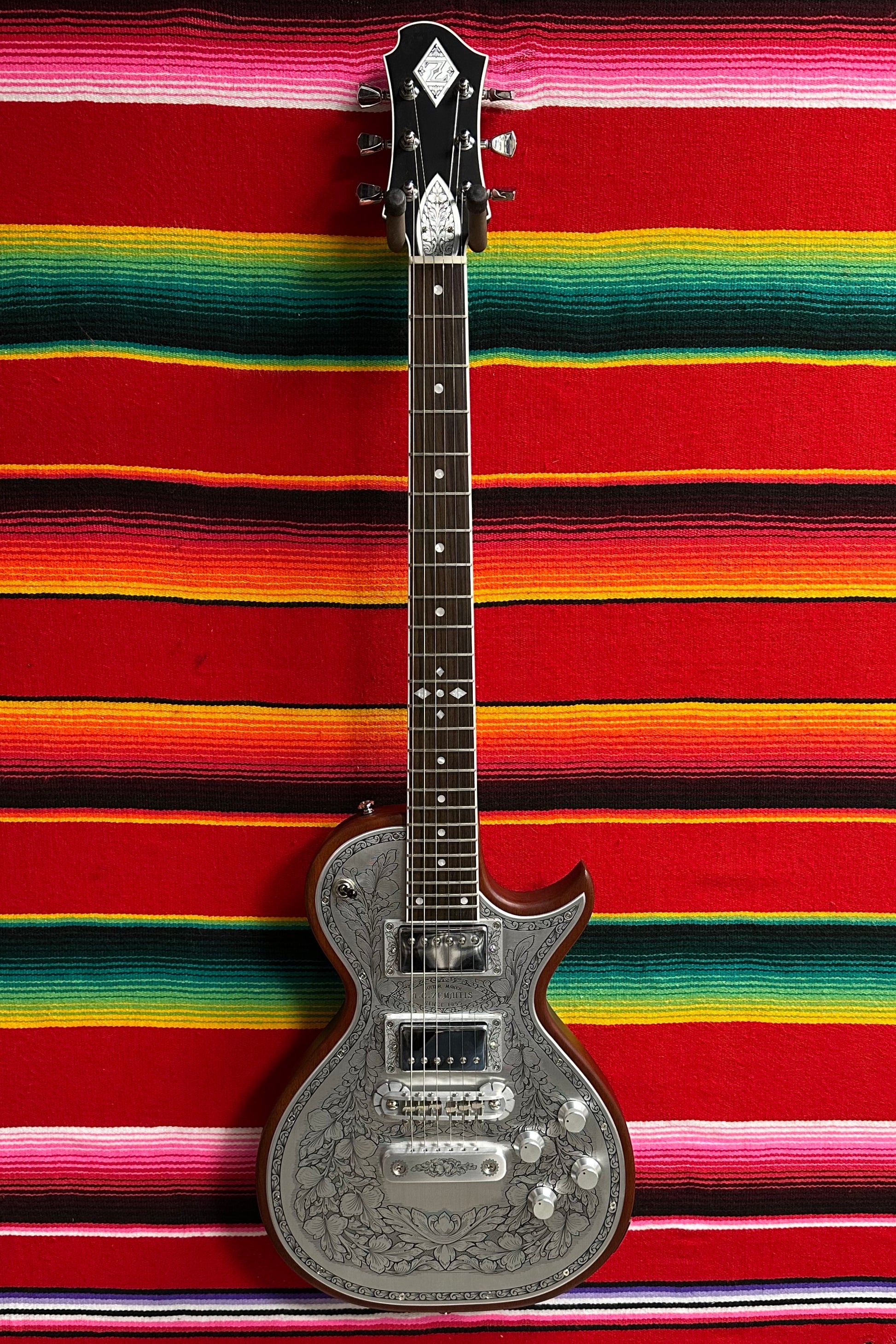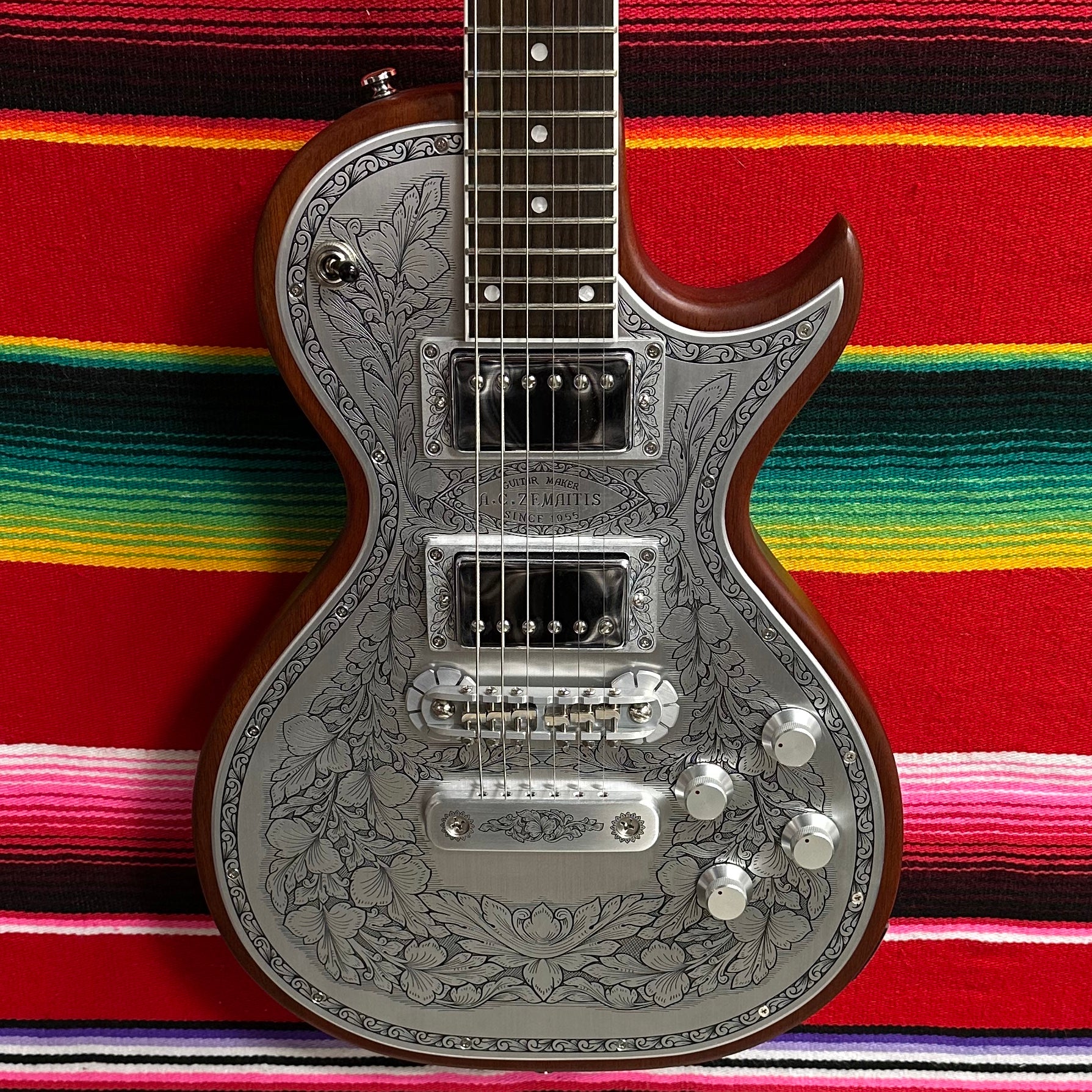 2015 Zemaitis C24MF NT Casimere Metal Front in Mahogany. Eastern Mahogany Body with Engraved Metal Top. Eastern Mahogany Neck with C Profile, Bound Headstock, and Engraved Metal Truss Rod Cover and Logo. Bound Rosewood Fretboard with Dot and Diamond Inlays. 1.69" Nut Width. 12" Fretboard Radius. 25" Scale Length. 2x Zemaitis D2 Classic Humbucking Pickups with Engraved Metal Pickup Rings and Individual Volume and Tone Controls. 3-way Selector Switch. Ornate Adjustable Bridge and Engraved Metal Stop Tailpiece. Comes with Bag